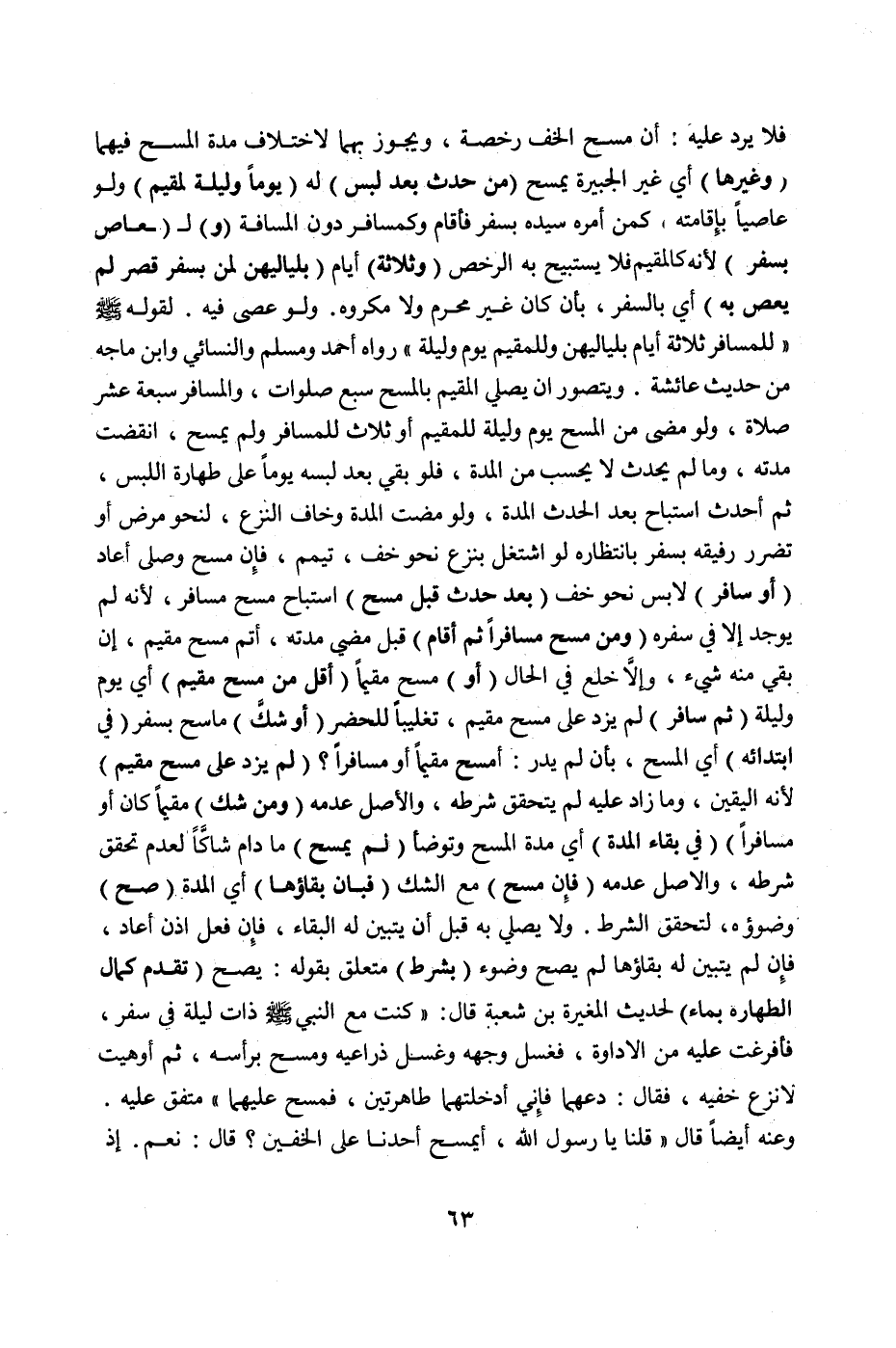 رَوَاهُ أَحْمَدُ وَمُسْلِمٌ وَالنَّسَائِيُّ وَابْنُ مَاجَهْ مِنْ حَدِيثِ عَائِشَةَ وَيُتَصَوَّرُ أَنْ يُصَلِّيَ الْمُقِيمُ بِالْمَسْحِ سَبْعَ صَلَوَاتٍ، وَالْمُسَافِرُ سَبْعَةَ عَشَرَ صَلَاةً، وَلَوْ مَضَى مِنْ الْمَسْحِ يَوْمٌ وَلَيْلَةٌ لِلْمُقِيمِ أَوْ ثَلَاثٌ لِلْمُسَافِرِ وَلَمْ يَمْسَحْ، انْقَضَتْ مُدَّتُهُ، وَمَا لَمْ يُحْدِثْ لَا يُحْسَبُ مِنْ الْمُدَّةِ، فَلَوْ بَقِيَ بَعْدَ لُبْسِهِ يَوْمًا عَلَى طَهَارَةِ اللُّبْسِ، ثُمَّ أَحْدَثَ اسْتَبَاحَ بَعْدَ الْحَدَثِ الْمُدَّةَ، وَلَوْ مَضَتْ الْمُدَّةُ وَخَافَ النَّزْعَ، لِنَحْوِ مَرَضٍ أَوْ تَضَرَّرَ رَفِيقُهُ بِسَفَرٍ بِانْتِظَارِهِ لَوْ اشْتَغَلَ بِنَزْعِ نَحْوِ خُفٍّ، تَيَمَّمَ، فَإِنْ مَسَحَ وَصَلَّى أَعَادَ.