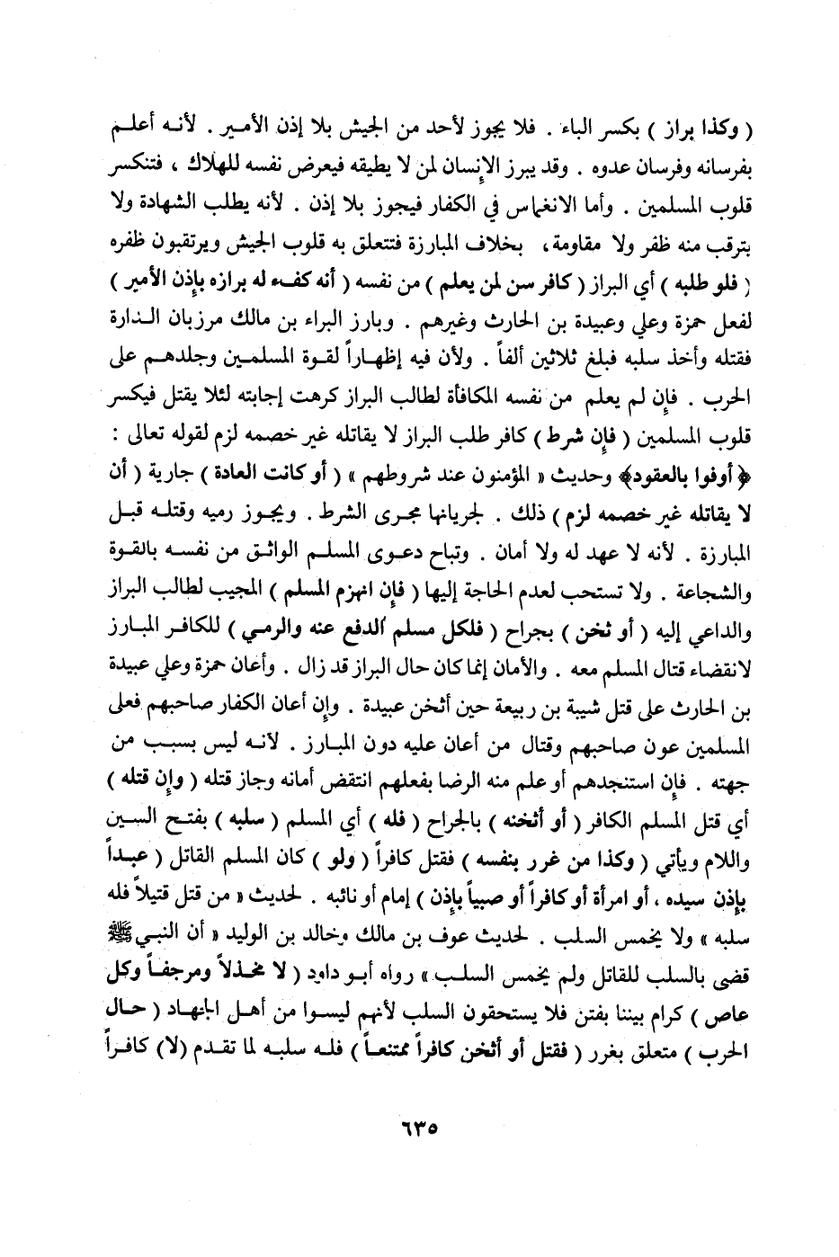 (وَكَذَا بِرَازٌ) بِكَسْرِ الْبَاءِ. فَلَا يَجُوزُ لِأَحَدٍ مِنْ الْجَيْشِ بِلَا إذْنِ الْأَمِيرِ ; لِأَنَّهُ أَعْلَمُ بِفُرْسَانِهِ وَفُرْسَانِ عَدُوِّهِ. وَقَدْ يَبْرُزُ الْإِنْسَانُ لِمَنْ لَا يُطِيقُهُ فَيُعَرِّضُ نَفْسَهُ لِلْهَلَاكِ، فَتَنْكَسِرُ قُلُوبُ الْمُسْلِمِينَ.