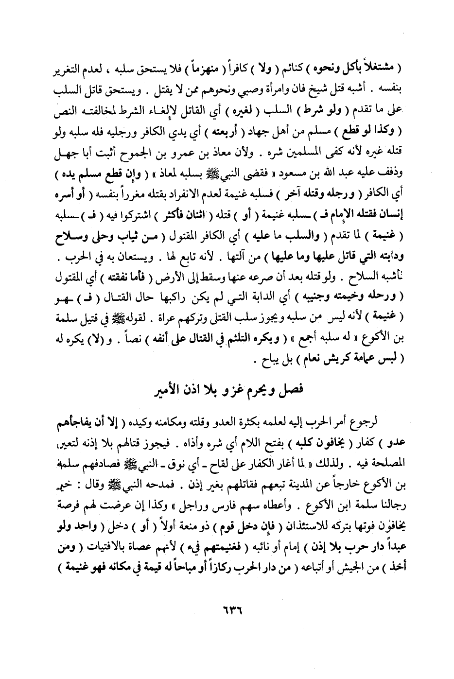 فَصْلٌ وَيَحْرُمُ غَزْوٌ بِلَا إذْنِ الْأَمِيرِ لِرُجُوعِ أَمْرِ الْحَرْبِ إلَيْهِ لِعِلْمِهِ بِكَثْرَةِ الْعَدُوِّ وَقِلَّتِهِ وَمَكَامِنِهِ وَكَيْدِهِ (إلَّا أَنْ يُفَاجِئَهُمْ عَدُوٌّ) كُفَّارٌ (يَخَافُونَ كَلَبَهُ) بِفَتْحِ اللَّامِ أَيْ شَرَّهُ وَأَذَاهُ. فَيَجُوزُ قِتَالُهُمْ بِلَا إذْنِهِ لِتَعَيُّنِ الْمَصْلَحَةِ فِيهِ. وَلِذَلِكَ «لَمَّا أَغَارَ الْكُفَّارُ عَلَى لِقَاحِ أَيْ نُوقِ النَّبِيِّ صَلَّى اللَّهُ عَلَيْهِ وَسَلَّمَ فَصَادَفَهُمْ سَلَمَةُ بْنُ الْأَكْوَعِ خَارِجًا عَنْ الْمَدِينَةِ تَبِعَهُمْ فَقَاتَلَهُمْ بِغَيْرِ إذْنٍ فَمَدَحَهُ النَّبِيُّ صَلَّى اللَّهُ عَلَيْهِ وَسَلَّمَ وَقَالَ: خَيْرُ رِجَالِنَا سَلَمَةُ بْنُ الْأَكْوَعِ وَأَعْطَاهُ سَهْمَ فَارِسٍ وَرَاجِلٍ» وَكَذَا إنْ عَرَضَتْ لَهُمْ فُرْصَةٌ يَخَافُونَ فَوْتَهَا بِتَرْكِهِ لِلِاسْتِئْذَانِ.