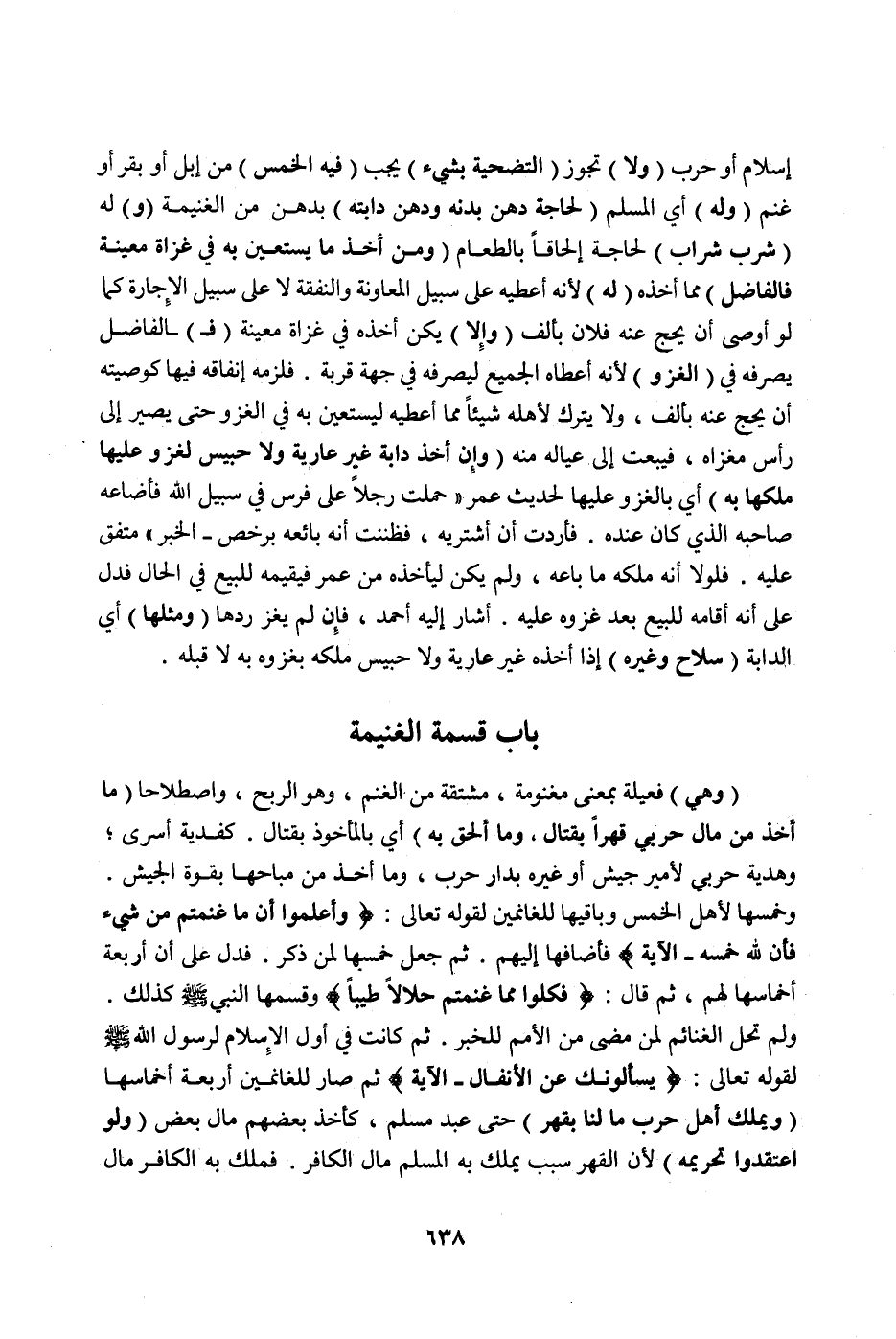 (وَلَا) تَجُوزُ (التَّضْحِيَةُ بِشَيْءٍ) يَجِبُ (فِيهِ الْخُمْسُ) مِنْ إبِلٍ أَوْ بَقَرٍ أَوْ غَنَمٍ (وَلَهُ) أَيْ الْمُسْلِمِ (لِحَاجَةٍ ; دَهْنُ بَدَنِهِ وَدَهْنُ دَابَّتِهِ) بِدُهْنٍ مِنْ الْغَنِيمَةِ.