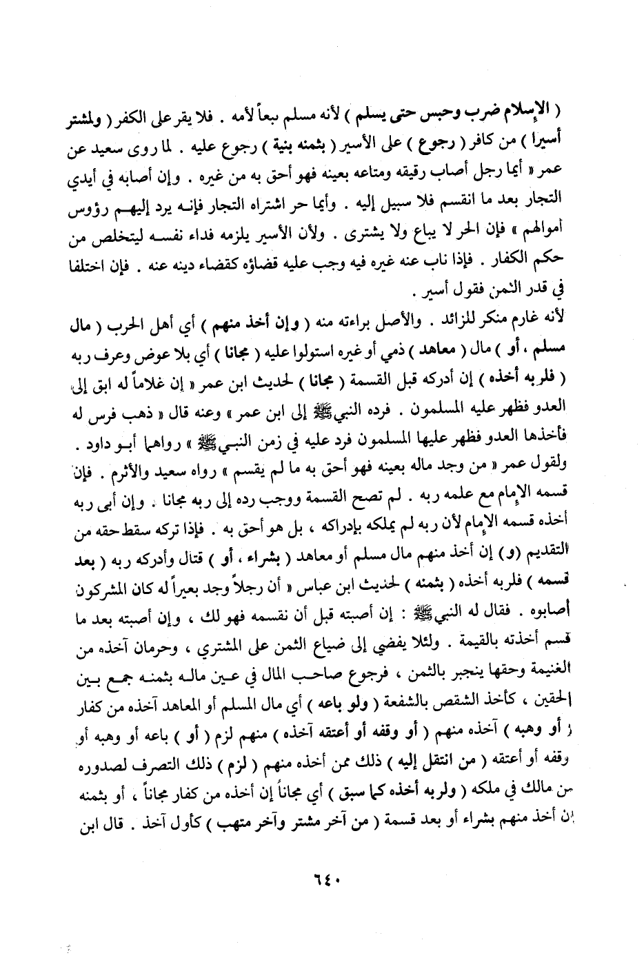(وَ) إنْ أُخِذَ مِنْهُمْ مَالُ مُسْلِمٍ أَوْ مُعَاهَدٍ (بِشِرَاءٍ، أَوْ) قِتَالٍ وَأَدْرَكَهُ رَبُّهُ (بَعْدَ قَسْمِهِ) فَلِرَبِّهِ أَخْذُهُ (بِثَمَنِهِ) لِحَدِيثِ ابْنِ عَبَّاسٍ «أَنَّ رَجُلًا وَجَدَ بَعِيرًا لَهُ كَانَ الْمُشْرِكُونَ أَصَابُوهُ فَقَالَ لَهُ النَّبِيُّ صَلَّى اللَّهُ عَلَيْهِ وَسَلَّمَ: إنْ أَصَبْتَهُ قَبْلَ أَنْ نَقْسِمَهُ فَهُوَ لَك، وَإِنْ أَصَبْته بَعْدَ مَا قُسِمَ أَخَذْته بِالْقِيمَةِ» . وَلِئَلَّا يُفْضِيَ إلَى ضَيَاعِ الثَّمَنِ عَلَى الْمُشْتَرِي، وَحِرْمَانِ آخِذِهِ مِنْ الْغَنِيمَةِ، وَحَقُّهَا يَنْجَبِرُ بِالثَّمَنِ، فَرُجُوعُ صَاحِبِ الْمَالِ فِي عَيْنِ مَالِهِ بِثَمَنِهِ جَمْعٌ بَيْنَ الْحَقَّيْنِ، كَأَخْذِ الشِّقْصِ بِالشُّفْعَةِ.