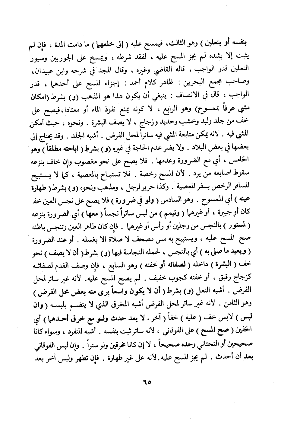 بِنَفْسِهِ أَوْ بِنَعْلَيْنِ) وَهُوَ الثَّالِثُ، فَيَمْسَحُ عَلَيْهِ (إلَى خَلْعِهِمَا) مَا دَامَتْ الْمُدَّةُ، فَإِنْ لَمْ يَثْبُتْ إلَّا بِشَدِّهِ لَمْ يَجُزْ الْمَسْحُ عَلَيْهِ، لِفَقْدِ شَرْطِهِ، وَيَمْسَحُ عَلَى الْجَوْرَبَيْنِ وَسُيُورَ النَّعْلَيْنِ قَدْرَ الْوَاجِبِ، قَالَهُ الْقَاضِي وَغَيْرُهُ، وَقَالَ الْمَجْدُ فِي شَرْحِهِ وَابْنُ عُبَيْدَانَ، وَصَاحِبُ مَجْمَعِ الْبَحْرَيْنِ: ظَاهِرُ كَلَامِ أَحْمَدَ: إجْزَاءُ الْمَسْحِ عَلَى أَحَدِهِمَا، قَدْرَ الْوَاجِبِ، قَالَ فِي الْإِنْصَافِ: يَنْبَغِي أَنْ يَكُونَ هَذَا هُوَ الْمَذْهَبُ.