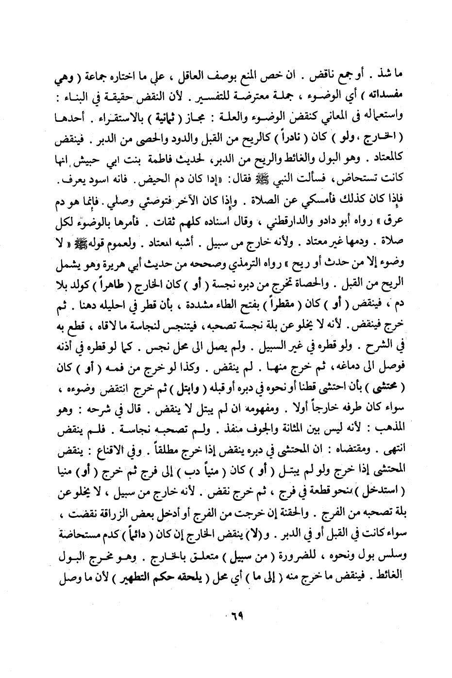 مَا شَذَّ أَوْ جَمْعُ نَاقِضٍ إنْ خُصَّ الْمَنْعُ بِوَصْفِ الْعَاقِلِ، عَلَى مَا اخْتَارَهُ جَمَاعَةٌ (وَهِيَ مُفْسِدَاتُهُ) أَيْ الْوُضُوءِ، جُمْلَةٌ مُعْتَرِضَةٌ لِلتَّفْسِيرِ ; لِأَنَّ النَّقْضَ حَقِيقَةٌ فِي الْبِنَاءِ: وَاسْتِعْمَالُهُ فِي الْمَعَانِي كَنَقْضِ الْوُضُوءِ، وَالْعِلَّةُ: مَجَازٌ (ثَمَانِيَةٌ) بِالِاسْتِقْرَاءِ أَحَدُهَا (الْخَارِجُ وَلَوْ) كَانَ (نَادِرًا) كَالرِّيحِ مِنْ الْقُبُلِ وَالدُّودِ وَالْحَصَى مِنْ الدُّبُرِ، فَيَنْقُضُ كَالْمُعْتَادِ، وَهُوَ الْبَوْلُ وَالْغَائِطُ وَالرِّيحُ مِنْ الدُّبُرِ، لِحَدِيثِ «فَاطِمَةَ بِنْتِ أَبِي حُبَيْشٍ أَنَّهَا كَانَتْ تُسْتَحَاضُ، فَسَأَلَتْ النَّبِيَّ صَلَّى اللَّهُ عَلَيْهِ وَسَلَّمَ فَقَالَ: إذَا كَانَ دَمُ الْحَيْضِ فَإِنَّهُ أَسْوَدُ يُعْرَفُ فَإِذَا كَانَ كَذَلِكَ فَأَمْسِكِي عَنْ الصَّلَاةِ وَإِذَا كَانَ الْآخَرُ فَتَوَضَّئِي وَصَلِّي فَإِنَّمَا هُوَ دَمُ عِرْقٍ» . رَوَاهُ أَبُو دَاوُد وَالدَّارَقُطْنِيّ، وَقَالَ إسْنَادُهُ كُلُّهُمْ ثِقَاتٌ. فَأَمَرَهَا بِالْوُضُوءِ لِكُلِّ صَلَاةٍ وَدَمُهَا غَيْرُ مُعْتَادٍ. وَلِأَنَّهُ خَارِجٌ مِنْ سَبِيلٍ. أَشْبَهَ الْمُعْتَادَ وَلِعُمُومِ قَوْلِهِ صَلَّى اللَّهُ عَلَيْهِ وَسَلَّمَ «لَا وُضُوءَ إلَّا مِنْ حَدَثٍ أَوْ رِيحٍ» رَوَاهُ التِّرْمِذِيُّ وَصَحَّحَهُ مِنْ حَدِيثِ أَبِي هُرَيْرَةَ وَهُوَ يَشْمَلُ الرِّيحَ مِنْ الْقُبُلِ وَالْحَصَاةِ تَخْرُجُ مِنْ دُبُرِهِ نَجِسَةٌ (أَوْ) كَانَ الْخَارِجُ (طَاهِرًا) كَوَلَدٍ بِلَا دَمٍ، فَيَنْقُضُ.