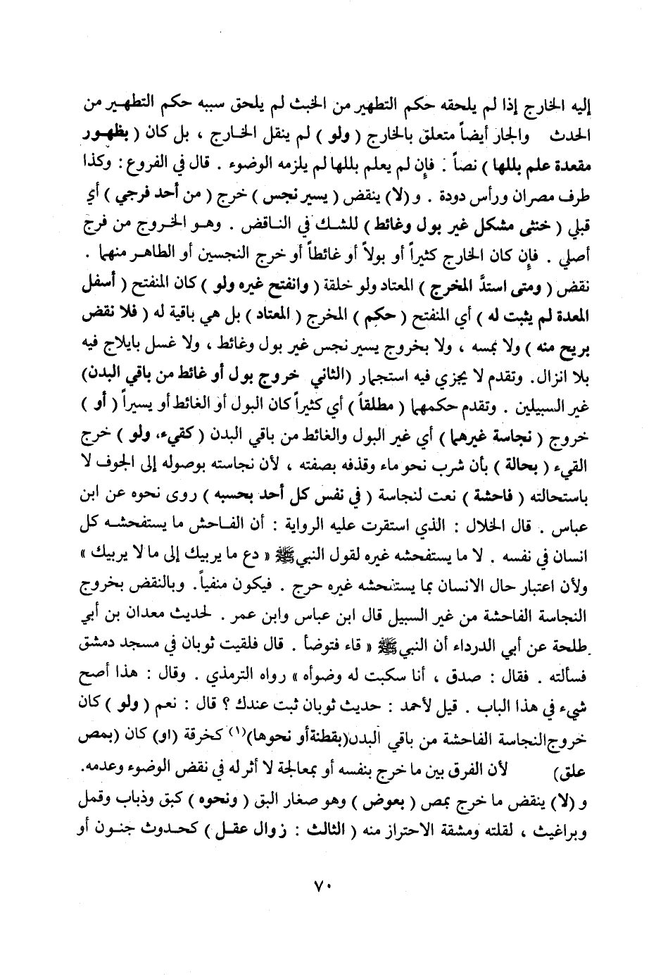 رُوِيَ نَحْوُهُ عَنْ ابْنِ عَبَّاسٍ قَالَ الْخَلَّالُ: الَّذِي اسْتَقَرَّتْ عَلَيْهِ الرِّوَايَةُ: أَنَّ الْفَاحِشَ مَا يَسْتَفْحِشُهُ كُلُّ إنْسَانٍ فِي نَفْسِهِ. لَا مَا يَسْتَفْحِشُهُ غَيْرُهُ لِقَوْلِ النَّبِيِّ صَلَّى اللَّهُ عَلَيْهِ وَسَلَّمَ «دَعْ مَا يَرِيبُكَ إلَى مَا لَا يَرِيبُكَ» وَلِأَنَّ اعْتِبَارَ حَالِ الْإِنْسَانِ بِمَا يَسْتَفْحِشُهُ غَيْرُهُ حَرَجٌ فَيَكُونُ مَنْفِيًّا. وَبِالنَّقْضِ بِخُرُوجِ النَّجَاسَةِ الْفَاحِشَةِ مِنْ غَيْرِ السَّبِيلِ قَالَ ابْنُ عَبَّاسٍ وَابْنُ عُمَرَ. لِحَدِيثِ مَعْدَانُ بْنِ أَبِي طَلْحَةَ عَنْ أَبِي الدَّرْدَاءِ «أَنَّ النَّبِيَّ صَلَّى اللَّهُ عَلَيْهِ وَسَلَّمَ قَاءَ فَتَوَضَّأَ. قَالَ فَلَقِيتُ ثَوْبَانَ فِي مَسْجِدِ دِمِشْقَ فَسَأَلْتُهُ. فَقَالَ: صَدَقَ، أَنَا سَكَبْتُ لَهُ وَضُوءَهُ» رَوَاهُ التِّرْمِذِيُّ. وَقَالَ: هَذَا أَصَحُّ شَيْءٍ فِي هَذَا الْبَابِ.