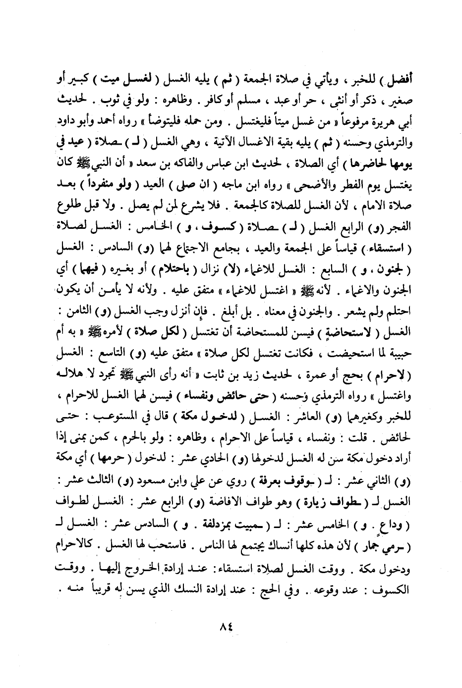 (وَ) الرَّابِعُ الْغُسْلُ (ل) صَلَاةِ (كُسُوفٍ وَ) الْخَامِسُ: الْغُسْلُ لِصَلَاةِ (اسْتِسْقَاءٍ) قِيَاسًا عَلَى الْجُمُعَةِ وَالْعِيدِ، بِجَامِعِ الْإِجْمَاعِ لَهُمَا (وَ) السَّادِسُ: الْغُسْلُ (لِجُنُونٍ.