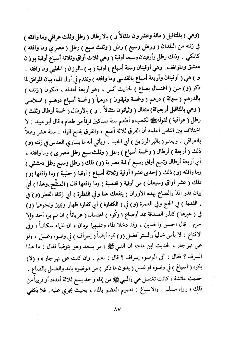 (وَ) سُنَّ (اغْتِسَالٌ (بِصَاعٍ)) لِحَدِيثِ أَنَسٍ، وَهُوَ أَرْبَعَةُ أَمْدَادٍ، فَتَكُونُ (زِنَتُهُ) بِالدِّرْهَمِ (سِتُّمِائَةِ) دِرْهَمٍ (وَخَمْسَةٌ وَثَمَانُونَ) دِرْهَمًا (وَخَمْسَةُ أَسْبَاعِ دِرْهَمٍ) إسْلَامِيٍّ (وَهِيَ بِالْمَثَاقِيلِ أَرْبَعُمِائَةِ) مِثْقَالٍ (وَثَمَانُونَ مِثْقَالًا. وَ) بِالْأَرْطَالِ (خَمْسَةُ أَرْطَالٍ وَثُلُثِ) رِطْلٍ (عِرَاقِيَّةٍ) لِقَوْلِهِ صَلَّى اللَّهُ عَلَيْهِ وَسَلَّمَ لِكَعْبٍ " أَطْعِمْ سِتَّةَ مَسَاكِينَ فَرَقًا مِنْ طَعَامٍ " قَالَ أَبُو عُبَيْدٍ: لَا اخْتِلَافَ بَيْنَ النَّاسِ أَعْلَمُهُ أَنَّ الْفَرَقَ ثَلَاثَةُ آصُعٍ،.