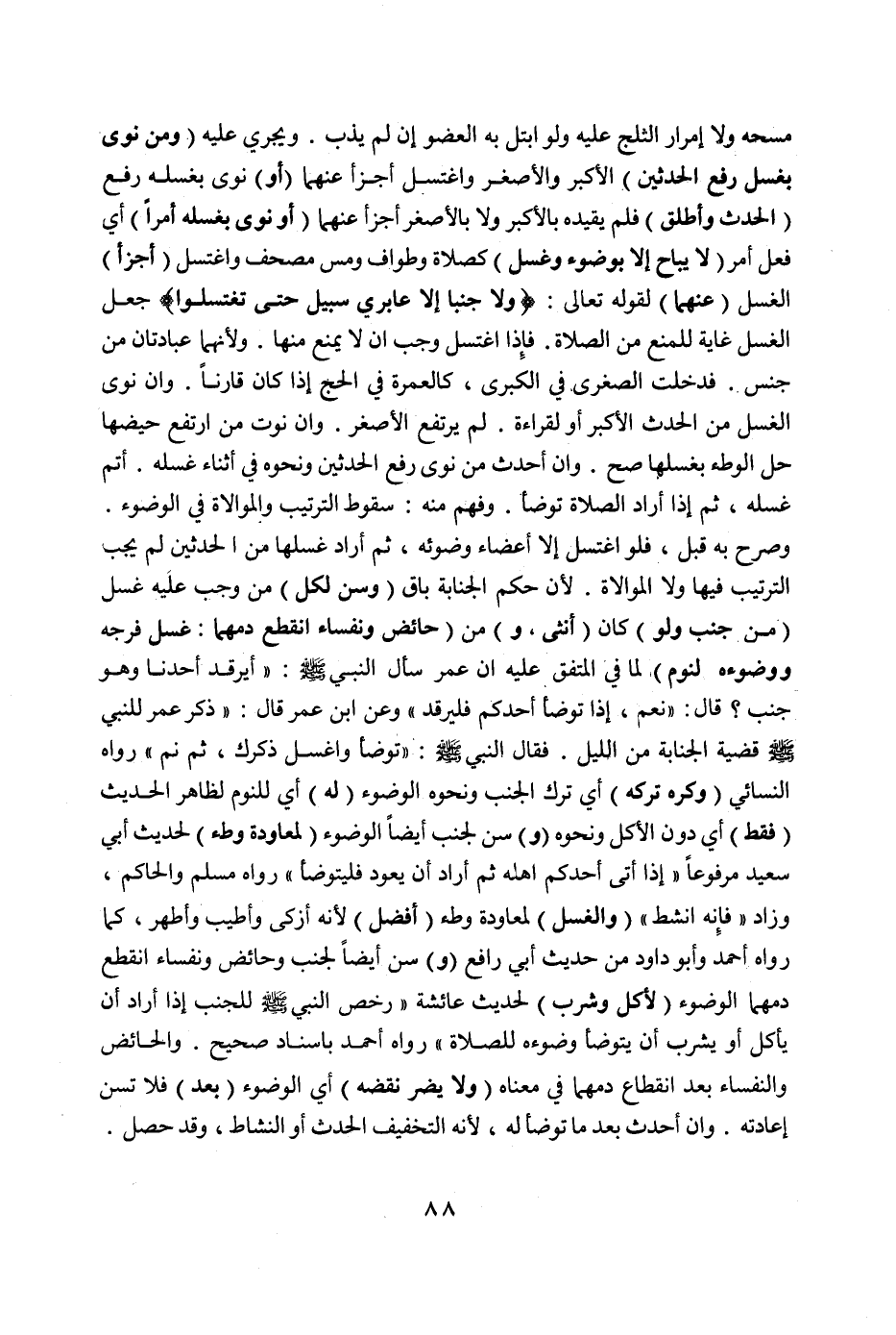 وَعَنْ ابْنِ عُمَرَ قَالَ: " «ذَكَرَ عُمَرُ لِلنَّبِيِّ صَلَّى اللَّهُ عَلَيْهِ وَسَلَّمَ قَضِيَّةَ الْجَنَابَةِ مِنْ اللَّيْلِ. فَقَالَ النَّبِيُّ صَلَّى اللَّهُ عَلَيْهِ وَسَلَّمَ: تَوَضَّأْ وَاغْسِلْ ذَكَرَكَ، ثُمَّ نَمْ» رَوَاهُ النَّسَائِيُّ (وَكُرِهَ تَرْكُهُ) أَيْ تَرْكُ الْجُنُبِ وَنَحْوِهِ الْوُضُوءَ (لَهُ) أَيْ لِلنَّوْمِ لِظَاهِرِ الْحَدِيثِ (فَقَطْ) أَيْ دُونَ الْأَكْلِ وَنَحْوِهِ.