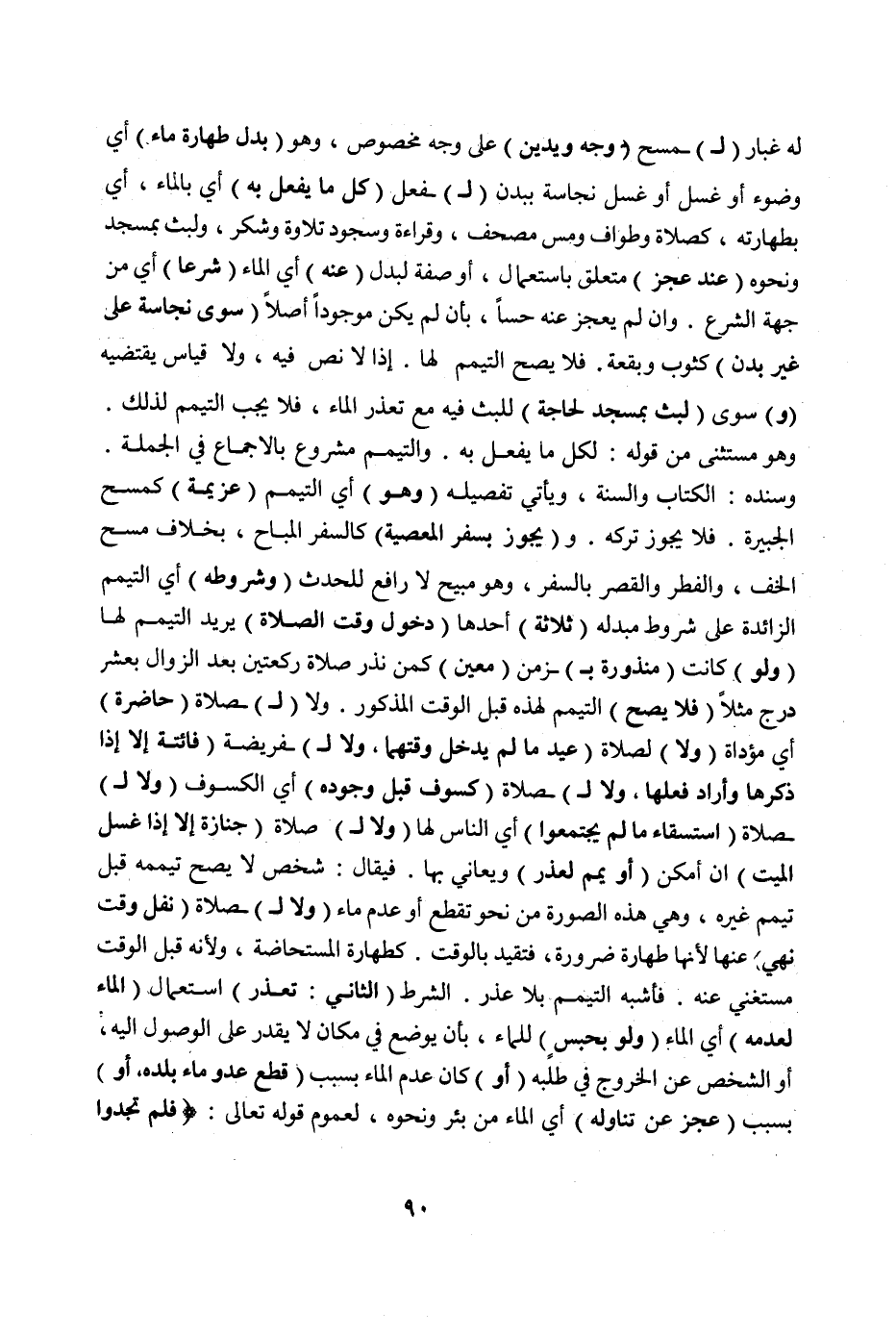لَهُ غُبَارٌ (لِ) مَسْحِ (وَجْهٍ وَيَدَيْنِ) عَلَى وَجْهٍ مَخْصُوصٍ، وَهُوَ (بَدَلُ طَهَارَةِ مَاءٍ) أَيْ وُضُوءٍ أَوْ غُسْلٍ أَوْ غُسْلِ نَجَاسَةٍ بِبَدَنٍ (لِ) فِعْلِ (كُلِّ مَا يُفْعَلُ بِهِ) أَيْ بِالْمَاءِ، أَيْ بِطَهَارَتِهِ، كَصَلَاةٍ وَطَوَافٍ وَمَسِّ مُصْحَفٍ، وَقِرَاءَةٍ وَسُجُودِ تِلَاوَةٍ وَشُكْرٍ، وَلُبْثٍ بِمَسْجِدٍ وَنَحْوِهِ (عِنْدَ عَجْزٍ) مُتَعَلِّقٌ بِاسْتِعْمَالٍ، أَوْ صِفَةٌ لِبَدَلٍ (عَنْهُ أَيْ الْمَاءِ (شَرْعًا) أَيْ مِنْ جِهَةِ الشَّرْعِ.