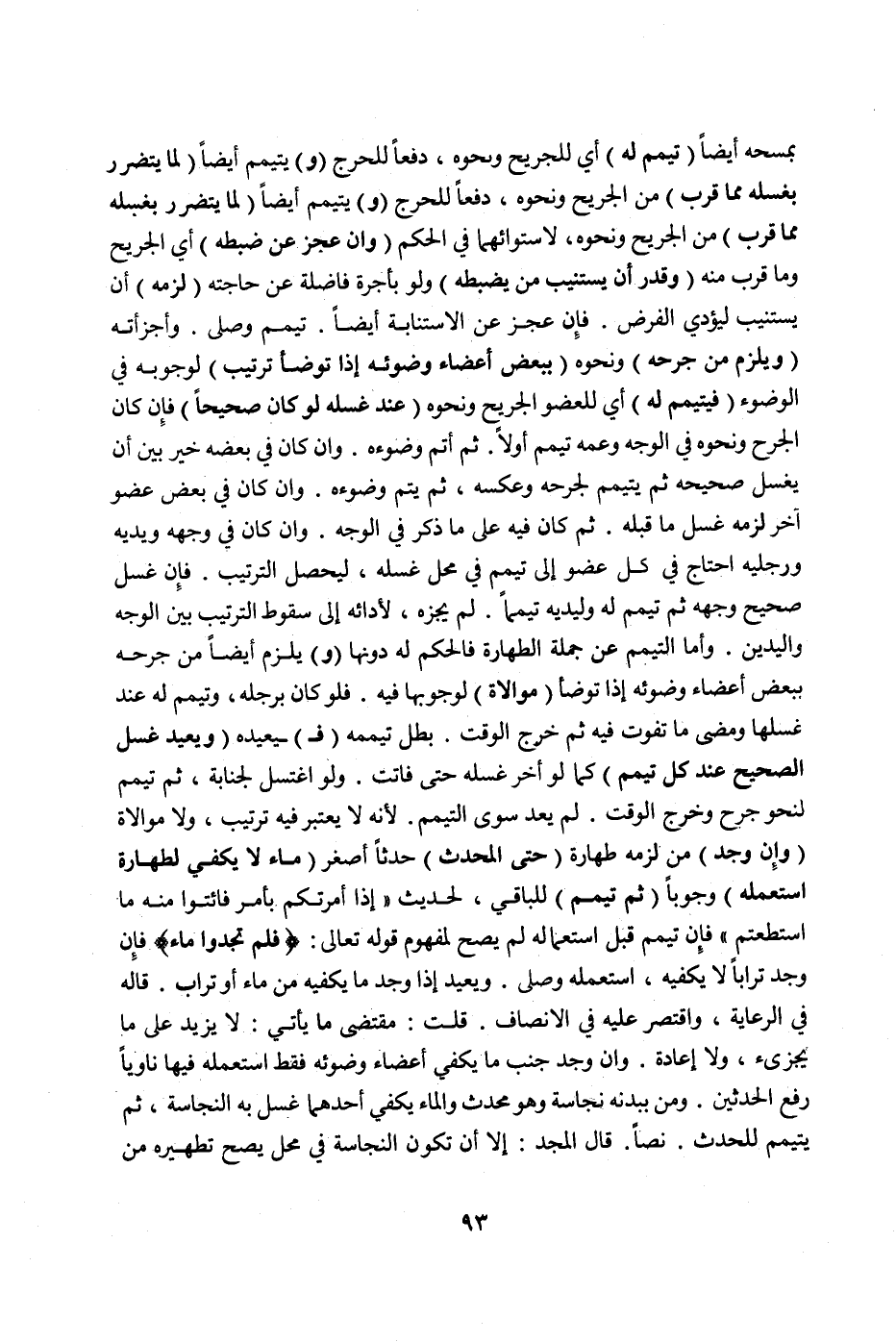 بِمَسْحِهِ أَيْضًا (تَيَمَّمَ لَهُ) أَيْ لِلْجَرِيحِ وَنَحْوِهِ، دَفْعًا لِلْحَرَجِ (وَ) يَتَيَمَّمُ أَيْضًا (لِمَا يَتَضَرَّرُ بِغُسْلِهِ مِمَّا قَرُبَ) مِنْ الْجَرِيحِ وَنَحْوِهِ، دَفْعًا لِلْحَرَجِ.