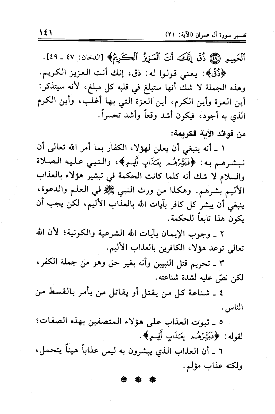 ١ - أنه ينبغي أن يعلن لهؤلاء الكفار بما أمر الله تعالى أن نبشرهم به: {فَبَشِّرْهُمْ بِعَذَابٍ أَلِيمٍ}، والنبي عليه الصلاة والسلام لا شك أنه كلما كانت الحكمة في تبشير هؤلاء بالعذاب الأليم بشرهم. وهكذا من ورث النبي - صلى الله عليه وسلم - في العلم والدعوة، ينبغي أن يبشر كل كافر بآيات الله بالعذاب الأليم، لكن يجب أن يكون هذا تابعًا للحكمة.