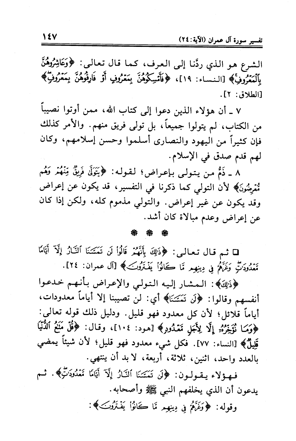 • ثم قال تعالى: {ذَلِكَ بِأَنَّهُمْ قَالُوا لَنْ تَمَسَّنَا النَّارُ إِلَّا أَيَّامًا مَعْدُودَاتٍ وَغَرَّهُمْ فِي دِينِهِمْ مَا كَانُوا يَفْتَرُونَ} [آل عمران: ٢٤].
