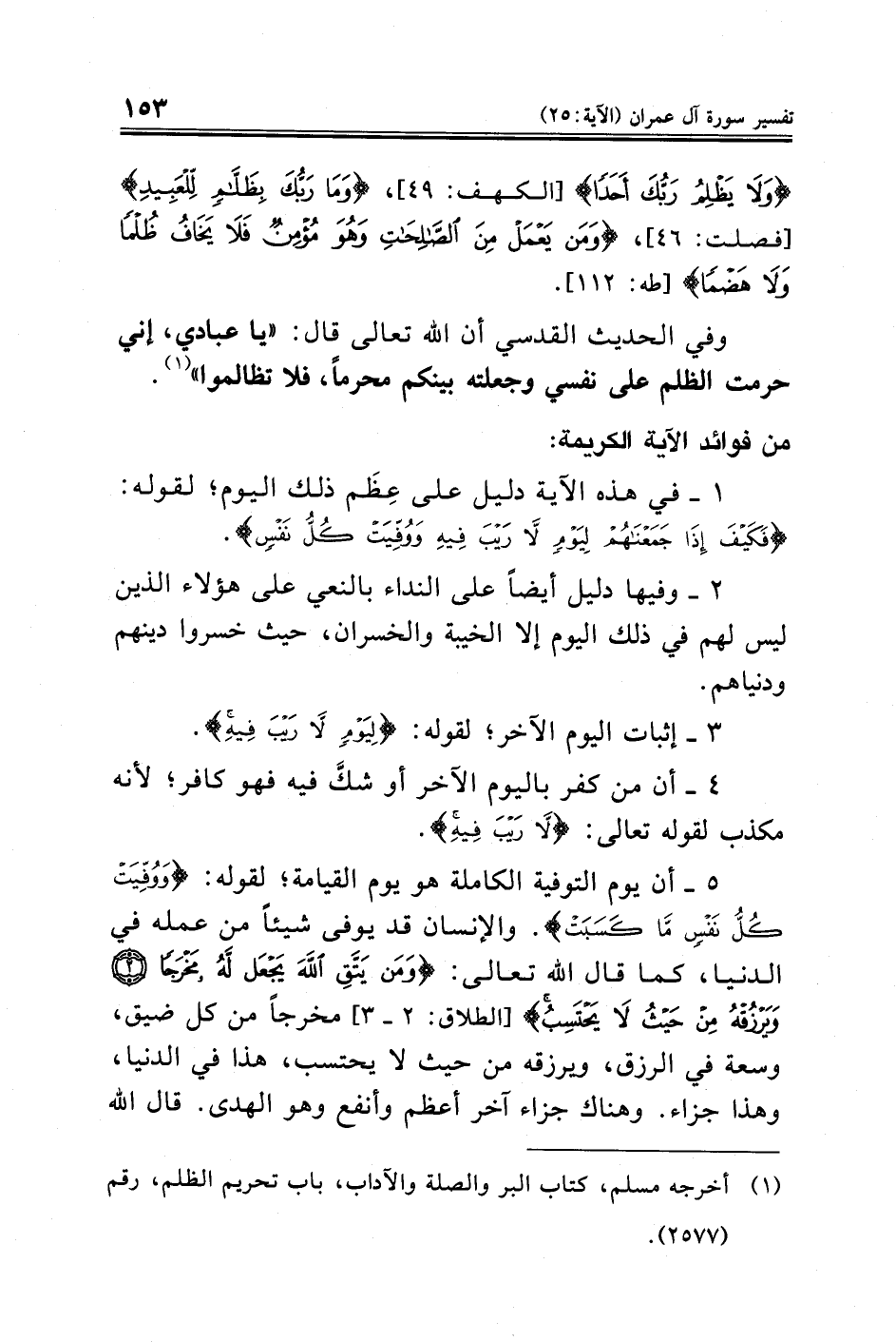١ - في هذه الآية دليل على عِظَم ذلك اليوم؛ لقوله: {فَكَيْفَ إِذَا جَمَعْنَاهُمْ لِيَوْمٍ لَا رَيْبَ فِيهِ وَوُفِّيَتْ كُلُّ نَفْسٍ}.