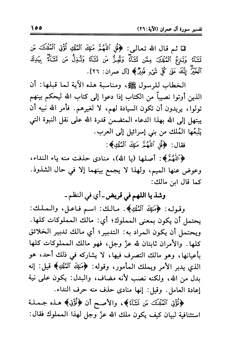 وقوله: {مَالِكَ الْمُلْكِ}. مالك: اسم فاعل، والملك: يحتمل أن يكون بمعنى المملوك؛ أي: مالك المملوكات كلها. ويحتمل أن يكون المراد به: التدبير؛ أي مالك تدبير الخلائق كلها. والأمران ثابتان لله عزّ وجل، فهو مالك المملوكات كلها بأعيانها، وهو مالك التصرف فيها, لا يشاركه في ذلك أحد، هو الذي يدبر الأمر ويملك المأمور، وقوله: {مَالِكَ الْمُلْكِ} قيل: إنه بدل من الله، ولكنه نصب لأنه مضاف، والبدل: يكون على نية إعادة العامل. وقيل: إنها منادى حذف منه حرف النداء.
