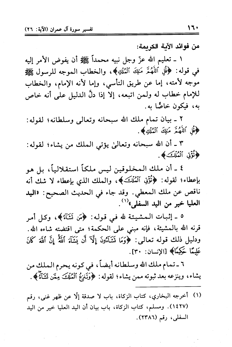 ٤ - أن ملك المخلوقين ليس ملكًا استقلاليًا، بل هو بإعطاء؛ لقوله: {تُؤْتِي الْمُلْكَ}، والملك الذي بإعطاء لا شك أنه ناقص عن ملك المعطي. وقد جاء في الحديث الصحيح: "اليد العليا خير من اليد السفلى" (¬١).