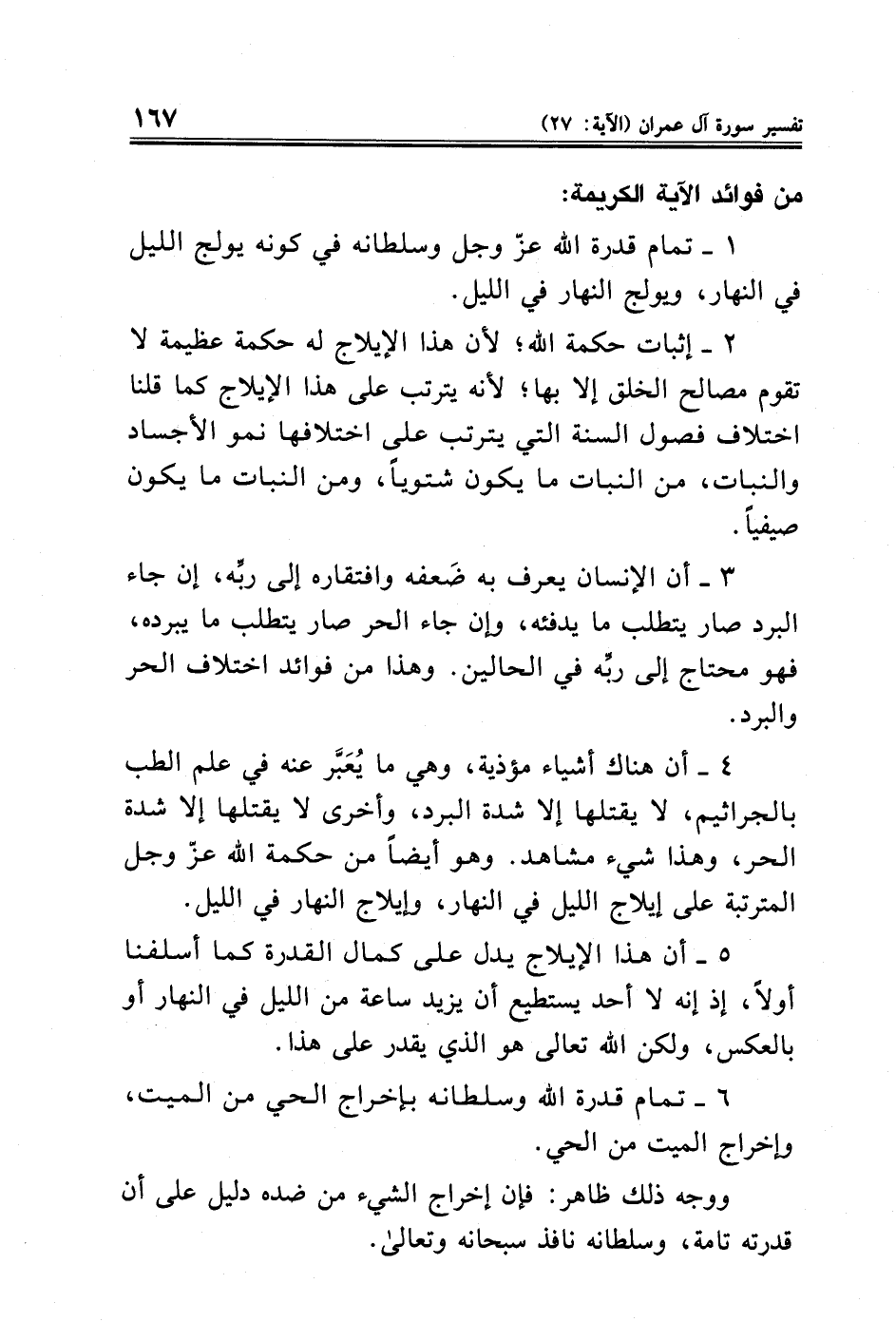 ٥ - أن هذا الإيلاج يدل على كمال القدرة كما أسلفنا أولًا، إذ إنه لا أحد يستطيع أن يزيد ساعة من الليل في النهار أو بالعكس، ولكن الله تعالى هو الذي يقدر على هذا.
