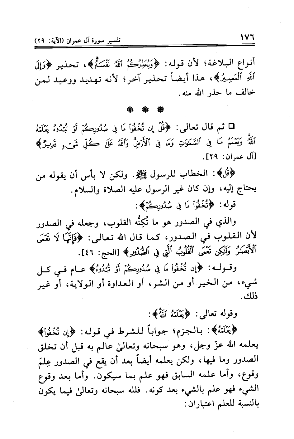 • ثم قال تعالى: {قُلْ إِنْ تُخْفُوا مَا فِي صُدُورِكُمْ أَوْ تُبْدُوهُ يَعْلَمْهُ اللَّهُ وَيَعْلَمُ مَا فِي السَّمَاوَاتِ وَمَا فِي الْأَرْضِ وَاللَّهُ عَلَى كُلِّ شَيْءٍ قَدِيرٌ} [آل عمران: ٢٩].