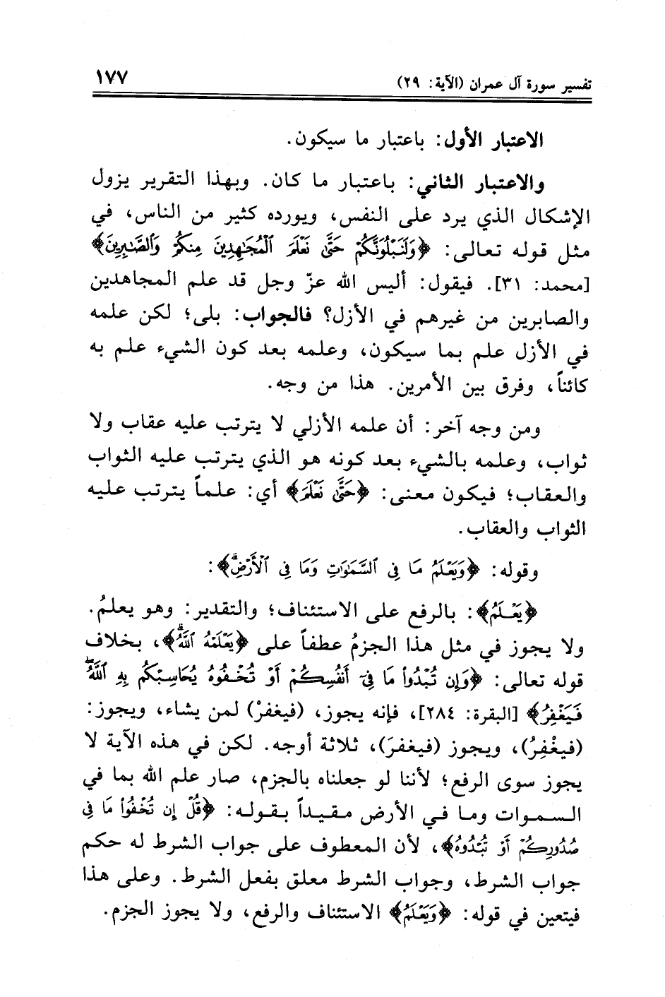 والاعتبار الثاني: باعتبار ما كان. وبهذا التقرير يزول الإشكال الذي يرد على النفس، ويورده كثير من الناس، في مثل قوله تعالى: {وَلَنَبْلُوَنَّكُمْ حَتَّى نَعْلَمَ الْمُجَاهِدِينَ مِنْكُمْ وَالصَّابِرِينَ} [محمد: ٣١]. فيقول: أليس الله عزّ وجل قد علم المجاهدين والصابرين من غيرهم في الأزل؟ فالجواب: بلى؛ لكن علمه في الأزل علم بما سيكون، وعلمه بعد كون الشيء علم به كائنًا، وفرق بين الأمرين. هذا من وجه.