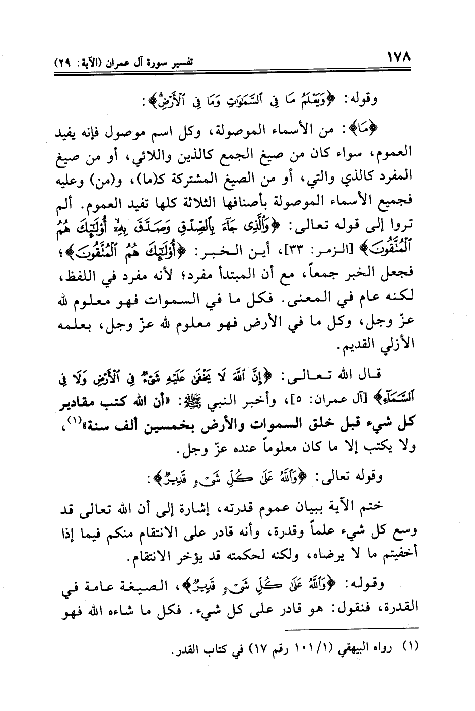 قال الله تعالى: {إِنَّ اللَّهَ لَا يَخْفَى عَلَيْهِ شَيْءٌ فِي الْأَرْضِ وَلَا فِي السَّمَاءِ} [آل عمران: ٥] , وأخبر النبي - صلى الله عليه وسلم -: "أن الله كتب مقادير كل شيء قبل خلق السموات والأرض بخمسين ألف سنة" (¬١)، ولا يكتب إلا ما كان معلومًا عنده عزّ وجل.