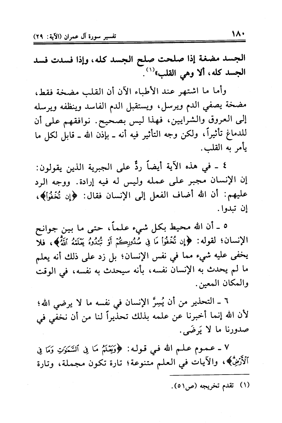 وأما ما اشتهر عند الأطباء الآن أن القلب مضخة فقط، مضخة يصفي الدم ويرسل، ويستقبل الدم الفاسد وينظفه ويرسله إلى العروق والشرايين، فهذا ليس بصحيح. نوافقهم على أن للدماغ تأثيرًا، ولكن وجه التأثير فيه أنه -بإذن الله- قابل لكل ما يأمر به القلب.