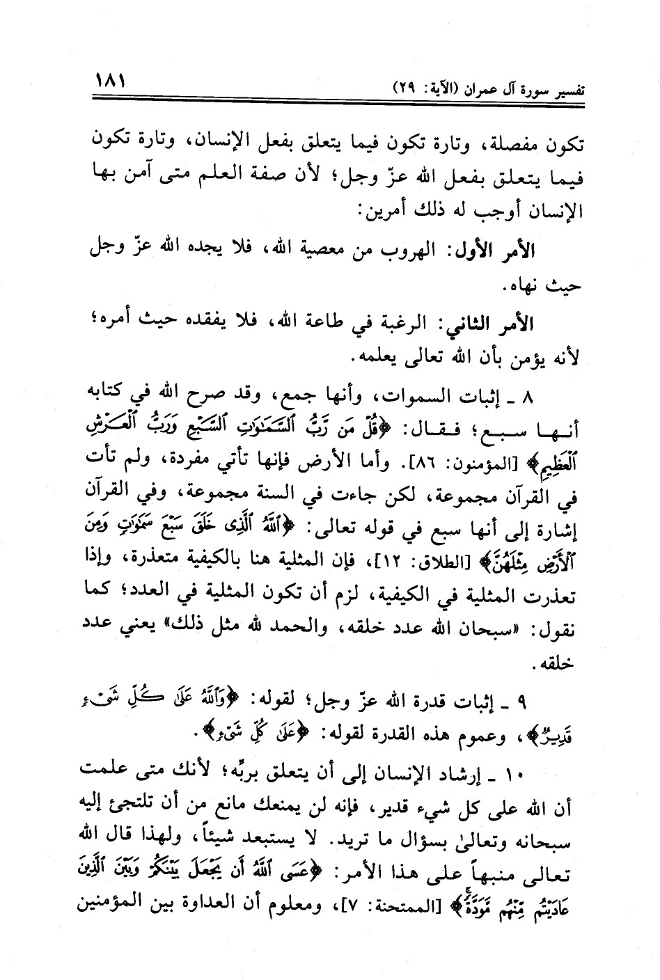 ٨ - إثبات السموات، وأنها جمع, وقد صرح الله في كتابه أنها سبع؛ فقال: {قُلْ مَنْ رَبُّ السَّمَاوَاتِ السَّبْعِ وَرَبُّ الْعَرْشِ الْعَظِيمِ} [المؤمنون: ٨٦]. وأما الأرض فإنها تأتي مفردة، ولم تأت في القرآن مجموعة، لكن جاءت في السنة مجموعة، وفي القرآن إشارة إلى أنها سبع في قوله تعالى: {اللَّهُ الَّذِي خَلَقَ سَبْعَ سَمَاوَاتٍ وَمِنَ الْأَرْضِ مِثْلَهُنَّ} [الطلاق: ١٢] , فإن المثلية هنا بالكيفية متعذرة، وإذا تعذرت المثلية في الكيفية، لزم أن تكون المثلية في العدد؛ كما نقول: "سبحان الله عدد خلقه، والحمد لله مثل ذلك" يعني عدد خلقه.