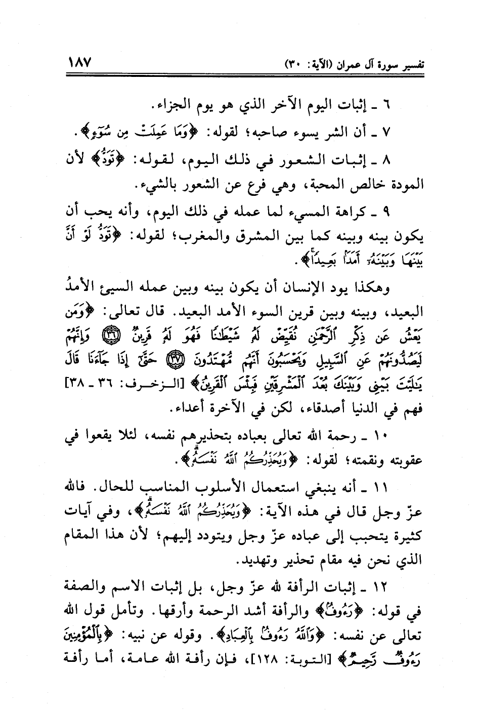 ١١ - أنه ينبغي استعمال الأسلوب المناسب للحال. فالله عزّ وجل قال في هذه الآية: {وَيُحَذِّرُكُمُ اللَّهُ نَفْسَهُ} , وفي آيات كثيرة يتحبب إلى عباده عزّ وجل ويتودد إليهم؛ لأن هذا المقام الذي نحن فيه مقام تحذير وتهديد.