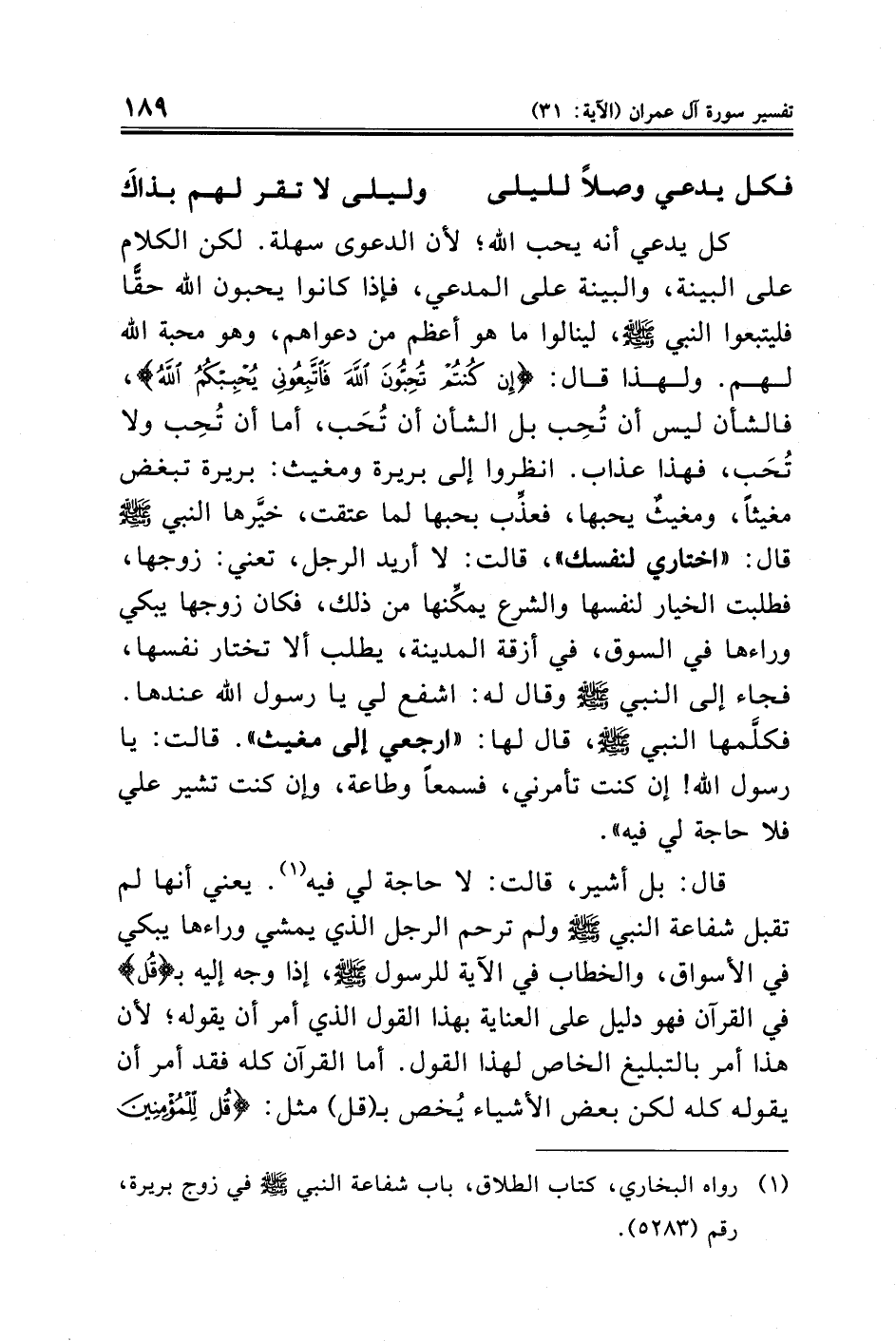 كل يدعي أنه يحب الله؛ لأن الدعوى سهلة. لكن الكلام على البينة، والبينة على المدعي, فإذا كانوا يحبون الله حقًّا فليتبعوا النبي - صلى الله عليه وسلم -، لينالوا ما هو أعظم من دعواهم، وهو محبة الله لهم. ولهذا قال: {إِنْ كُنْتُمْ تُحِبُّونَ اللَّهَ فَاتَّبِعُونِي يُحْبِبْكُمُ اللَّهُ} , فالشأن ليس أن تُحِب بل الشأن أن تُحَب، أما أن تُحِب ولا تُحَب، فهذا عذاب. انظروا إلى بريرة ومغيث: بريرة تبغض مغيثًا، ومغيثٌ يحبها، فعذِّب بحبها لما عتقت، خيَّرها النبي - صلى الله عليه وسلم - قال: "اختاري لنفسك"، قالت: لا أريد الرجل، تعني: زوجها، فطلبت الخيار لنفسها والشرع يمكِّنها من ذلك، فكان زوجها يبكي وراءها في السوق، في أزقة المدينة, يطلب ألا تختار نفسها، فجاء إلى النبي - صلى الله عليه وسلم - وقال له: اشفع لي يا رسول الله عندها. فكلَّمها النبي - صلى الله عليه وسلم -، قال لها: "ارجعي إلى مغيث". قالت: يا رسول الله - صلى الله عليه وسلم - إن كنت تأمرني، فسمعًا وطاعة، وإن كنت تشير علي فلا حاجة لي فيه".