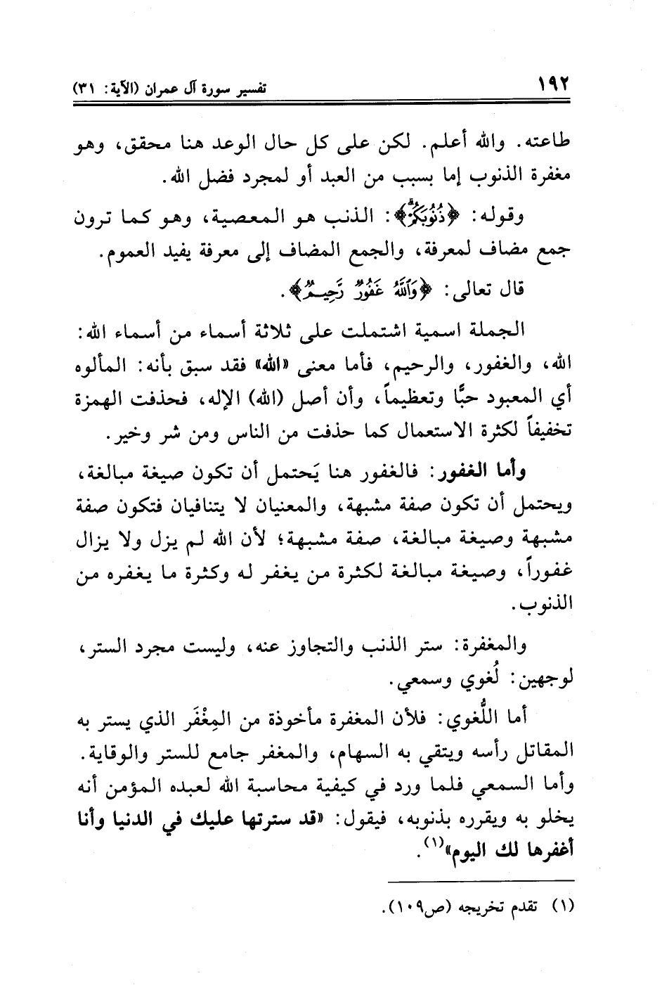 طاعته. والله أعلم. لكن على كل حال الوعد هنا محقق، وهو مغفرة الذنوب إما بسبب من العبد أو لمجرد فضل الله.