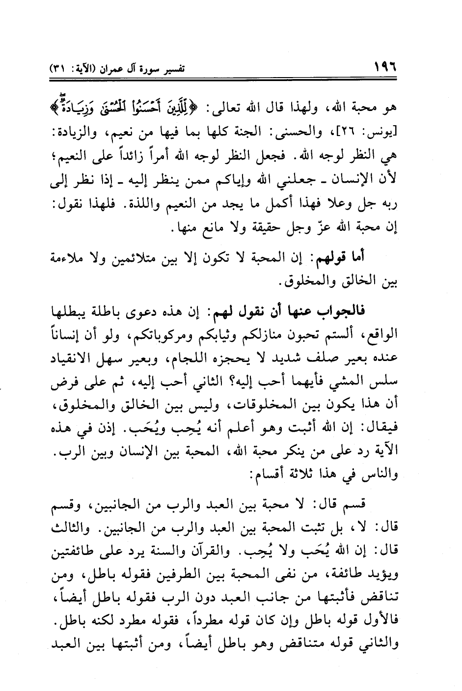 قسم قال: لا محبة بين العبد والرب من الجانبين، وقسم قال: لا، بل تثبت المحبة بين العبد والرب من الجانبين. والثالث قال: إن الله يُحَب ولا يُحِب. والقرآن والسنة يرد على طائفتين ويؤيد طائفة، من نفى المحبة بين الطرفين فقوله باطل، ومن تناقض فأثبتها من جانب العبد دون الرب فقوله باطل أيضًا، فالأول قوله باطل وإن كان قوله مطردًا، فقوله مطرد لكنه باطل. والثاني قوله متناقض وهو باطل أيضًا، ومن أثبتها بين العبد