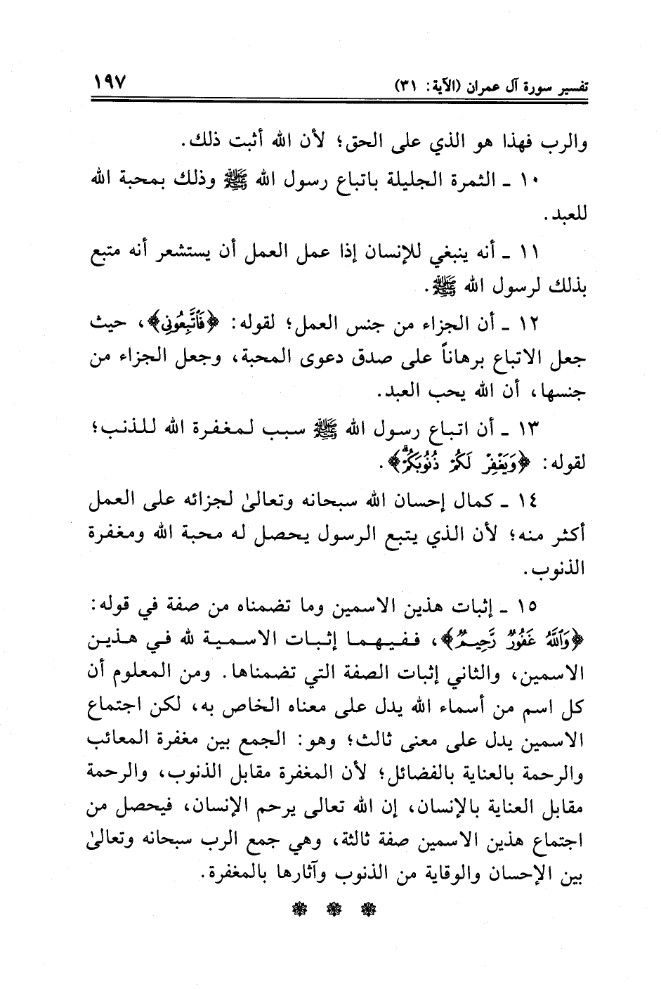 ١٢ - أن الجزاء من جنس العمل لقوله: {فَاتَّبِعُونِي}، حيث جعل الاتباع برهانًا على صدق دعوى المحبة، وجعل الجزاء من جنسها، أن الله يحب العبد.