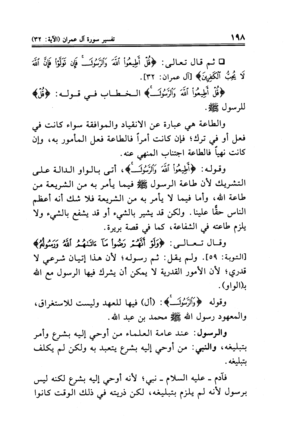 • ثم قال تعالى: {قُلْ أَطِيعُوا اللَّهَ وَالرَّسُولَ فَإِنْ تَوَلَّوْا فَإِنَّ اللَّهَ لَا يُحِبُّ الْكَافِرِينَ} [آل عمران: ٣٢].