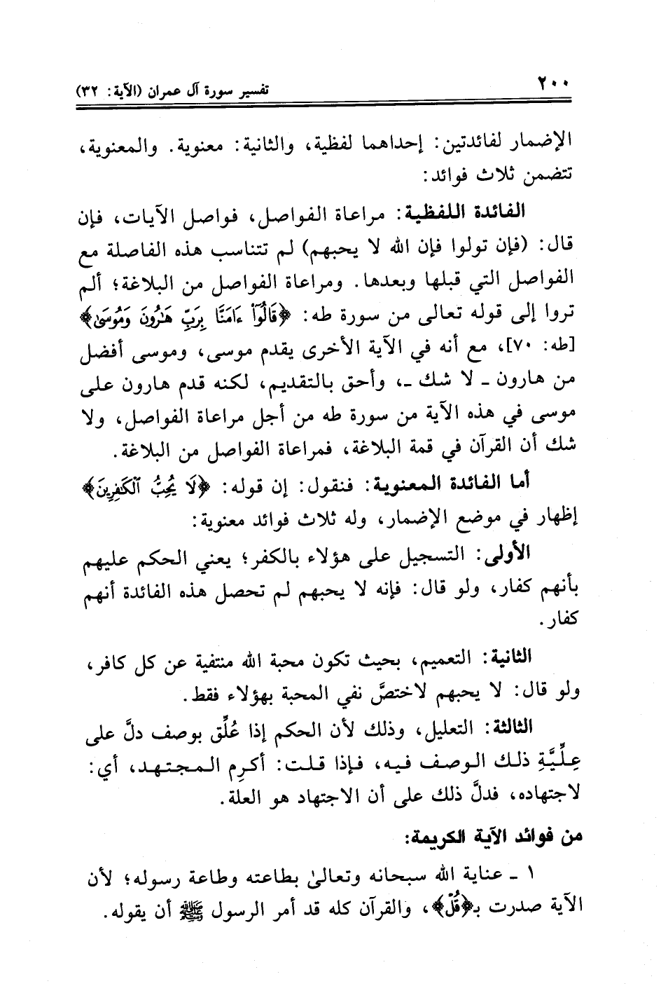 الفائدة اللفظية: مراعاة الفواصل، فواصل الآيات، فإن قال: (فإن تولوا فإن الله لا يحبهم) لم تتناسب هذه الفاصلة مع الفواصل التي قبلها وبعدها. ومراعاة الفواصل من البلاغة؛ ألم تروا إلى قوله تعالى من سورة طه: {قَالُوا آمَنَّا بِرَبِّ هَارُونَ وَمُوسَى} [طه: ٧٠] , مع أنه في الآية الأخرى يقدم موسى، وموسى أفضل من هارون -لا شك-، وأحق بالتقديم، لكنه قدم هارون على موسى في هذه الآية من سورة طه من أجل مراعاة الفواصل، ولا شك أن القرآن في قمة البلاغة، فمراعاة الفواصل من البلاغة.