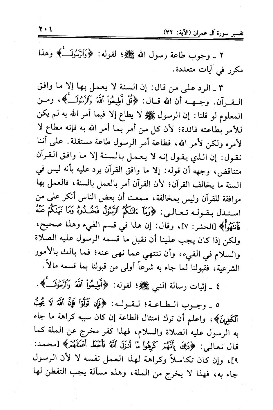 ٣ - الرد على من قال: إن السنة لا يعمل بها إلا ما وافق القرآن. وجهه أن الله قال: {قُلْ أَطِيعُوا اللَّهَ وَالرَّسُولَ}، ومن المعلوم لو قلنا: إن الرسول - صلى الله عليه وسلم - لا يطاع إلا فيما أمر الله به لم يكن للأمر بطاعته فائدة؛ لأن كل من أمر بما أمر الله به فإنه مطاع لا لأمره ولكن لأمر الله، فطاعة أمر الرسول طاعة مستقلة. على أننا نقول: إن الذي يقول إنه لا يعمل بالسنة إلا ما وافق القرآن متناقض، وجهه أن قوله: إلا ما وافق القرآن يرد عليه بأنه ليس في السنة ما يخالف القرآن؛ لأن القرآن أمر بالعمل بالسنة، فالعمل بها موافقة للقرآن وليس بمخالفة، سمعت أن بعض الناس أنكر على من استدل بقوله تعالى: {وَمَا آتَاكُمُ الرَّسُولُ فَخُذُوهُ وَمَا نَهَاكُمْ عَنْهُ فَانْتَهُوا} [الحشر: ٧]، وقال: إن هذا قسم الفيء وهذا صحيح، ولكن إذا كان يجب علينا أن نقبل ما قسمه الرسول عليه الصلاة والسلام في الفيء، وأن ننتهي عما نهى عنه؛ فما بالك بالأمور الشرعية، فقبولنا لما جاء به شرعًا أولى من قبولنا بما قسمه مالًا.