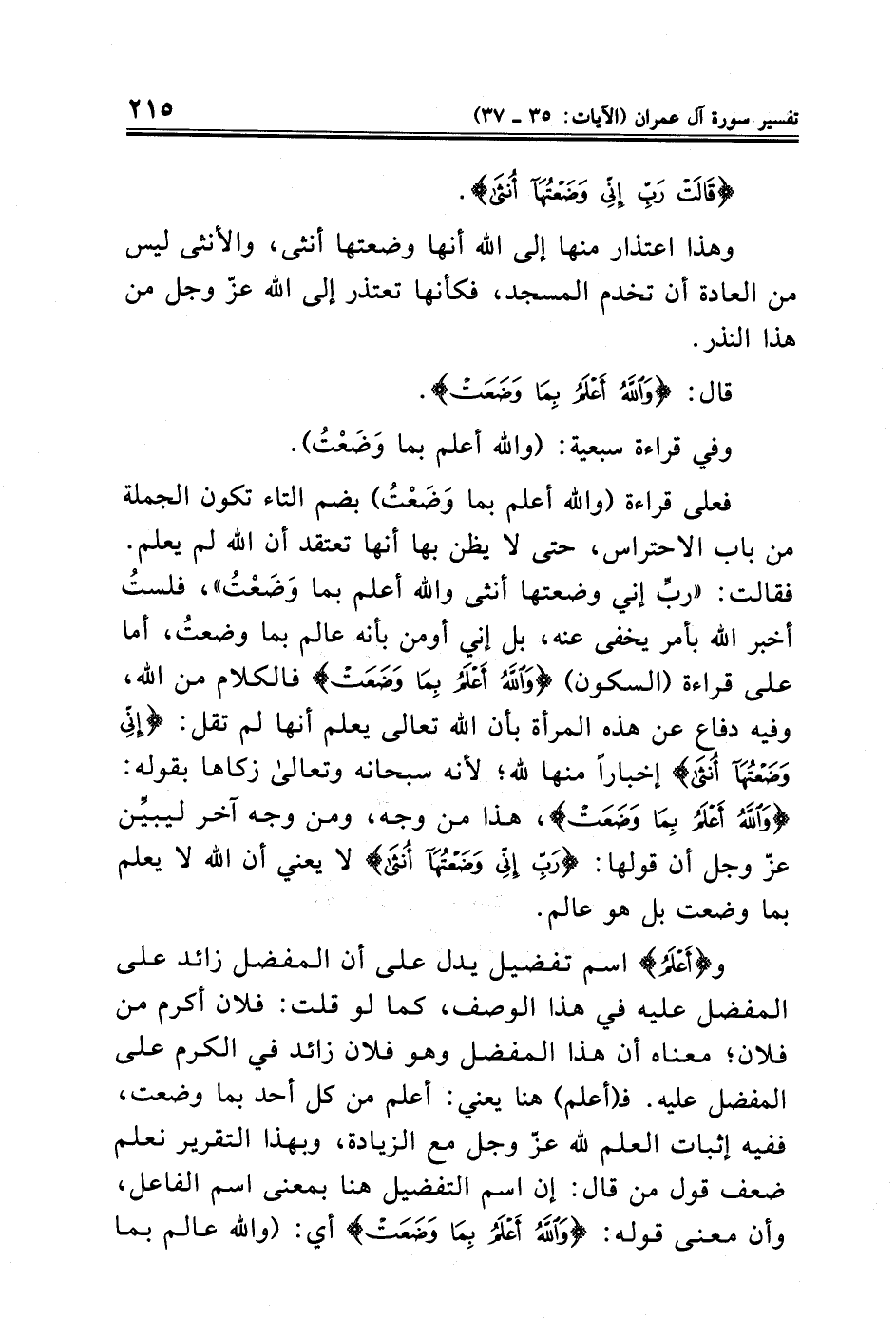 فعلى قراءة {وَاللَّهُ أَعْلَمُ بِمَا وَضَعْتُ} بضم التاء تكون الجملة من باب الاحتراس، حتى لا يظن أنها تعتقد أن الله لم يعلم. فقالت: {رَبِّ إِنِّي وَضَعْتُهَا أُنْثَى وَاللَّهُ أَعْلَمُ بِمَا وَضَعَتْ}، فلستُ أخبر الله بأمر يخفى عنه، بل إني أؤمن بأنه عالم بما وضعتُ، أما على قراءة (السكون) {وَاللَّهُ أَعْلَمُ بِمَا وَضَعَتْ} فالكلام من الله، وفيه دفاع عن هذه المرأة بأن الله تعالى يعلم أنها لم تقل: {إِنِّي وَضَعْتُهَا أُنْثَى} إخبارًا منها لله؛ لأنه سبحانه وتعالي زكاها بقوله: {وَاللَّهُ أَعْلَمُ بِمَا وَضَعَتْ}، هذا من وجه، ومن وجه آخر ليبيِّن عزّ وجل أن قولها: {رَبِّ إِنِّي وَضَعْتُهَا أُنْثَى} لا يعني أن الله لا يعلم بما وضعت بل هو عالم.