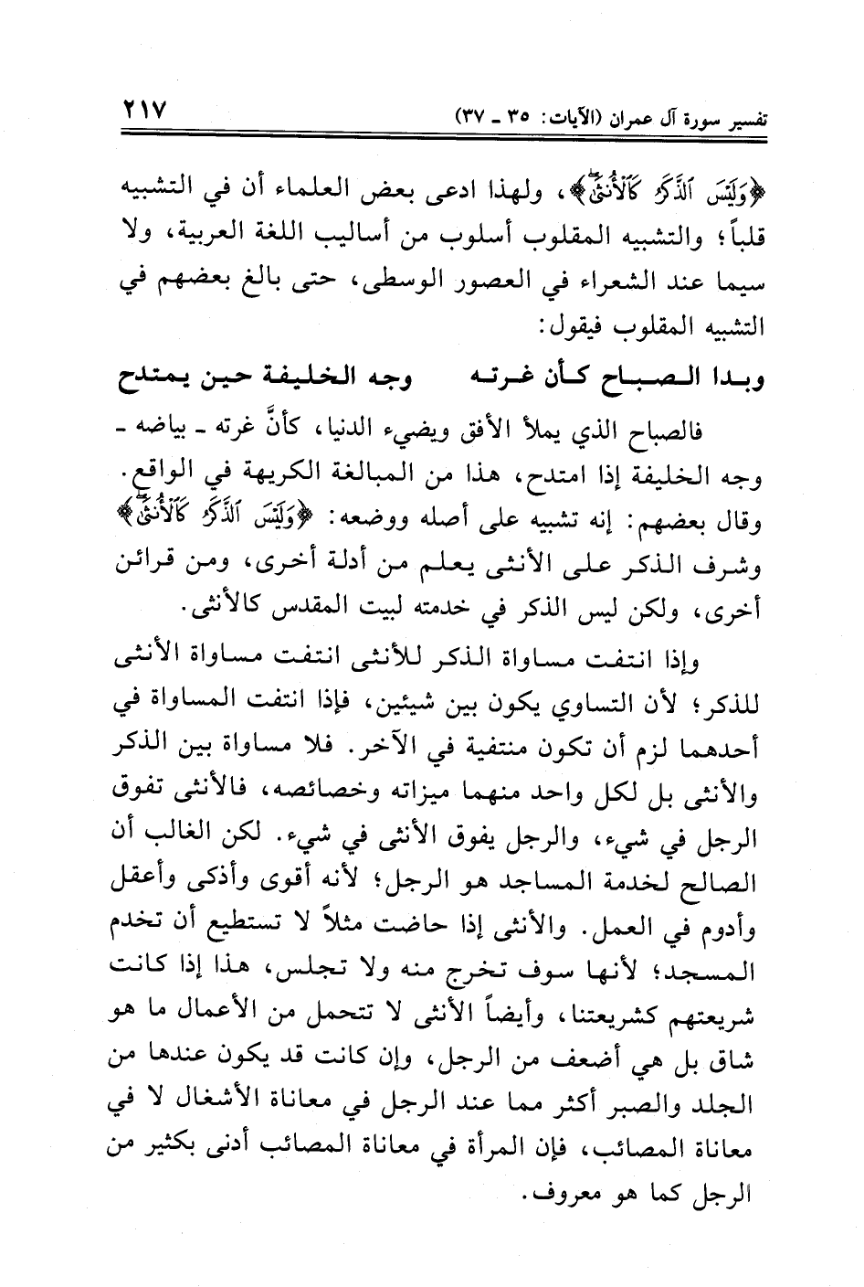 فالصباح الذي يملأ الأفق ويضيء الدنيا، كأنَّ غرته -بياضه- وجه الخليفة إذا امتدح، هذا من المبالغة الكريهة في الواقع. وقال بعضهم: إنه تشبيه على أصله ووضعه: {وَلَيْسَ الذَّكَرُ كَالْأُنْثَى} وشرف الذكر على الأنثى يعلم من أدلة أخرى، ومن قرائن أخرى، ولكن ليس الذكر في خدمته لبيت المقدس كالأنثى.