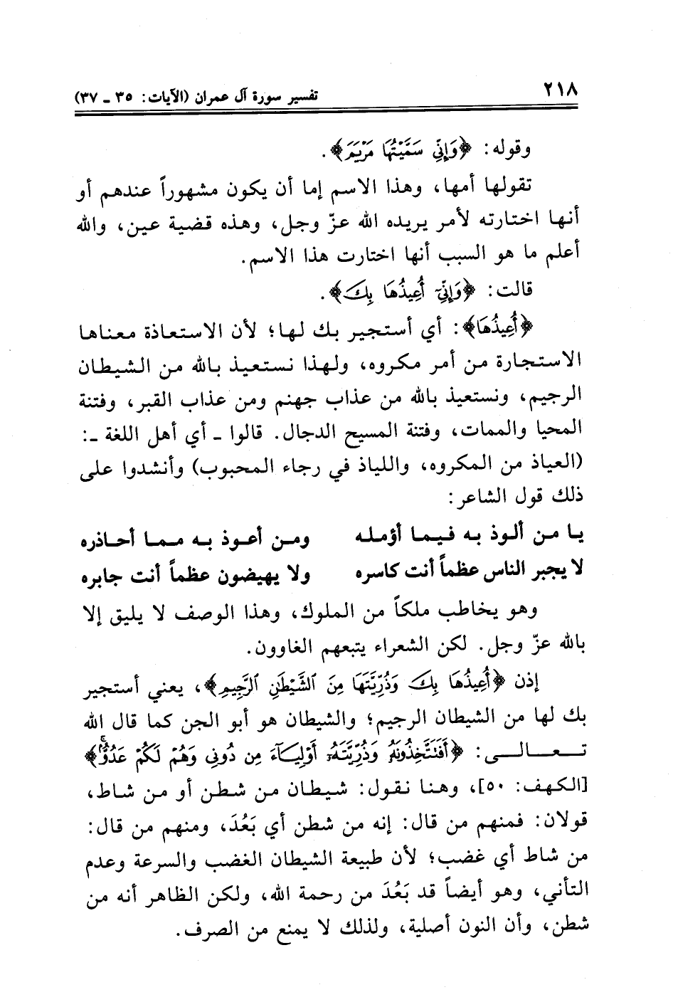 إذن {أُعِيذُهَا بِكَ وَذُرِّيَّتَهَا مِنَ الشَّيْطَانِ الرَّجِيمِ}، يعني أستجير بك لها من الشيطان الرجيم، والشيطان هو أبو الجن كما قال الله تعالى: {أَفَتَتَّخِذُونَهُ وَذُرِّيَّتَهُ أَوْلِيَاءَ مِنْ دُونِي وَهُمْ لَكُمْ عَدُوٌّ} [الكهف: ٥٠]، وهنا نقول: شيطان من شطن أو من شاط، قولان: فمنهم من قال: إنه من شطن أي بَعُدَ، ومنهم من قال: من شاط أي غضب؛ لأن طبيعة الشيطان الغضب والسرعة وعدم التأني، وهو أيضًا قد بَعُدَ من رحمة الله، ولكن الظاهر أنه من شطن، وأن النون أصلية، ولذلك لا يمنع من الصرف.