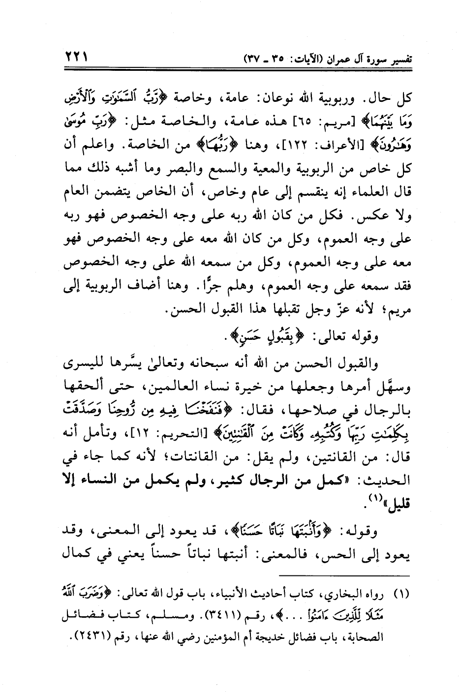 والقبول الحسن من الله أنه سبحانه وتعالى يسَّرها لليسرى وسهَّل أمرها وجعلها من خيرة نساء العالمين، حتى ألحقها بالرجال في صلاحها، فقال: {فَنَفَخْنَا فِيهِ مِنْ رُوحِنَا وَصَدَّقَتْ بِكَلِمَاتِ رَبِّهَا وَكُتُبِهِ وَكَانَتْ مِنَ الْقَانِتِينَ} [التحريم: ١٢]، وتأمل أنه قال: من القانتين، ولم يقل: من القانتات؛ لأنه كما جاء في الحديث: "كمل من الرجال كثير، ولم يكمل من النساء إلا قليل" (¬١).