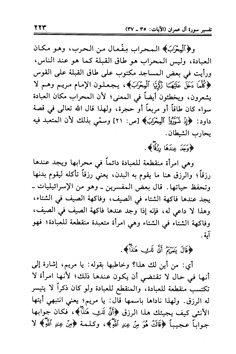و {الْمِحْرَابَ} المحراب مِفْعال من الحرب، وهو مكان العبادة، وليس المحراب هو طاق القبلة كما هو عند الناس، ورأيت في بعض المساجد مكتوب على طاق القبلة على القوس {كُلَّمَا دَخَلَ عَلَيْهَا زَكَرِيَّا الْمِحْرَابَ}، يجعلون الإمام مريم وهم لا يشعرون، ويخطئون أيضًا في المعنى؛ لأن المحراب مكان العبادة سواء كان طاقًا أو مربعًا أو حجرة، ولهذا قال الله تعالى فى قصة داود: {إِذْ تَسَوَّرُوا الْمِحْرَابَ} [ص: ٢١] وسمي بذلك لأن المتعبد فيه يحارب الشيطان.