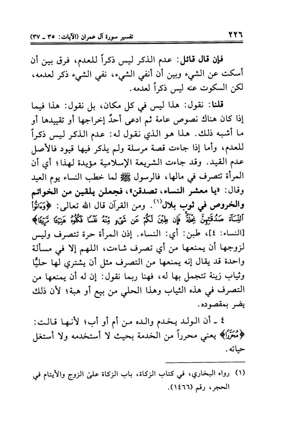 قلنا: نقول: هذا ليس في كل مكان، بل نقول: هذا فيما إذا كان هناك نصوص عامة ثم ادعى أحدٌ إخراجها أو تقييدها أو ما أشبه ذلك. هذا هو الذي نقول له: عدم الذكر ليس ذكرًا للعدم، وأما إذا جاءت قصة مرسلة ولم يذكر فيها قيود فالأصل عدم القيد. وقد جاءت الشريعة الإسلامية مؤيدة لهذا؛ أي أن المرأة تتصرف في مالها، فالرسول - صلى الله عليه وسلم - لما خطب النساء يوم العيد وقال: "يا معشر النساء، تصدقن"، فجعلن يلقين من الخواتم والخروص في ثوب بلال (¬١). ومن القرآن قال الله تعالى: {وَآتُوا النِّسَاءَ صَدُقَاتِهِنَّ نِحْلَةً فَإِنْ طِبْنَ لَكُمْ عَنْ شَيْءٍ مِنْهُ نَفْسًا فَكُلُوهُ هَنِيئًا مَرِيئًا} [النساء: ٤]، طبن: أي: النساء. إذن المرأة حرة تتصرف وليس لزوجها أن يمنعها من أي تصرف شاءت، اللهم إلا في مسألة واحدة قد يقال إنه يمنعها من التصرف مثل أن يشتري لها حليًّا وثياب زينة تتجمل بها له، فهنا ربما نقول: إن له أن يمنعها من التصرف في هذه الثياب وهذا الحلي من بيع أو هبة؛ لأن ذلك يضر بمقصوده.