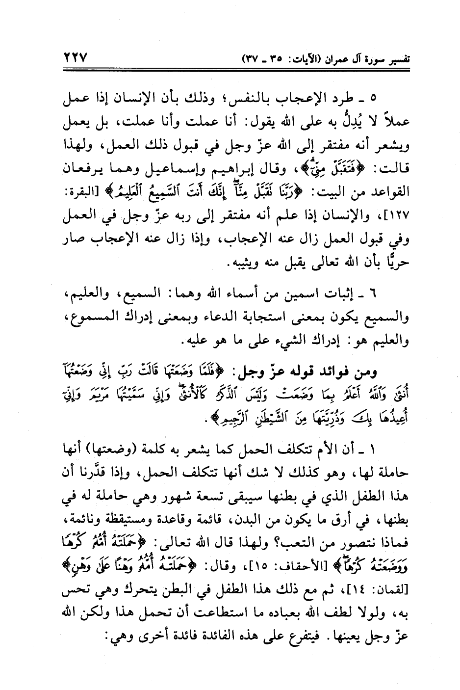 ٥ - طرد الإعجاب بالنفس؛ وذلك بأن الإنسان إذا عمل عملًا لا يُدِلُّ به على الله يقول: أنا عملت وأنا عملت، بل يعمل ويشعر أنه مفتقر إلى الله عزّ وجل في قبول ذلك العمل، ولهذا قالت: {فَتَقَبَّلْ مِنِّي}، وقال إبراهيم وإسماعيل وهما يرفعان القواعد من البيت: {رَبَّنَا تَقَبَّلْ مِنَّا إِنَّكَ أَنْتَ السَّمِيعُ الْعَلِيمُ} [البقرة: ١٢٧]، والإنسان إذا علم أنه مفتقر إلى ربه عزّ وجل في العمل وفي قبول العمل زال عنه الإعجاب، وإذا زال عنه الإعجاب صار حريًّا بأن الله تعالى يقبل منه ويثيبه.
