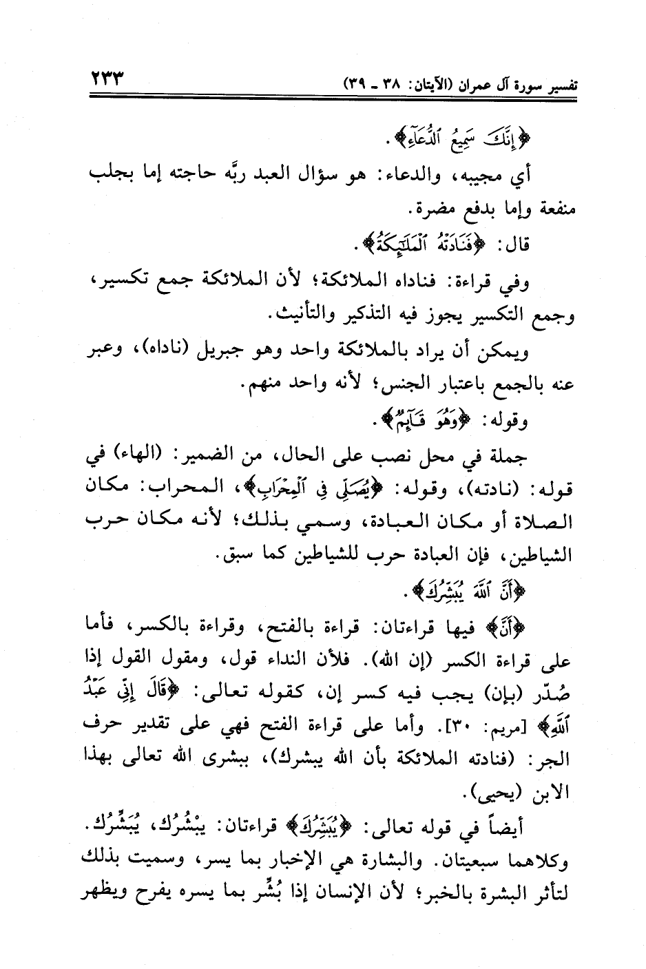 {أَنَّ} فيها قراءتان: قراءة بالفتح، وقراءة بالكسر، فأما على قراءة الكسر (إن الله). فلأن النداء قول، ومقول القول إذا صُدّر (بإن) يجب فيه كسر إن، كقوله تعالي: {قَالَ إِنِّي عَبْدُ اللَّهِ} [مريم: ٣٠]. وأما على قراءة الفتح فهي على تقدير حرف الجر: (فنادته الملائكة بأن الله يبشرك)، ببشري الله تعالي بهذا الابن (يحيى).