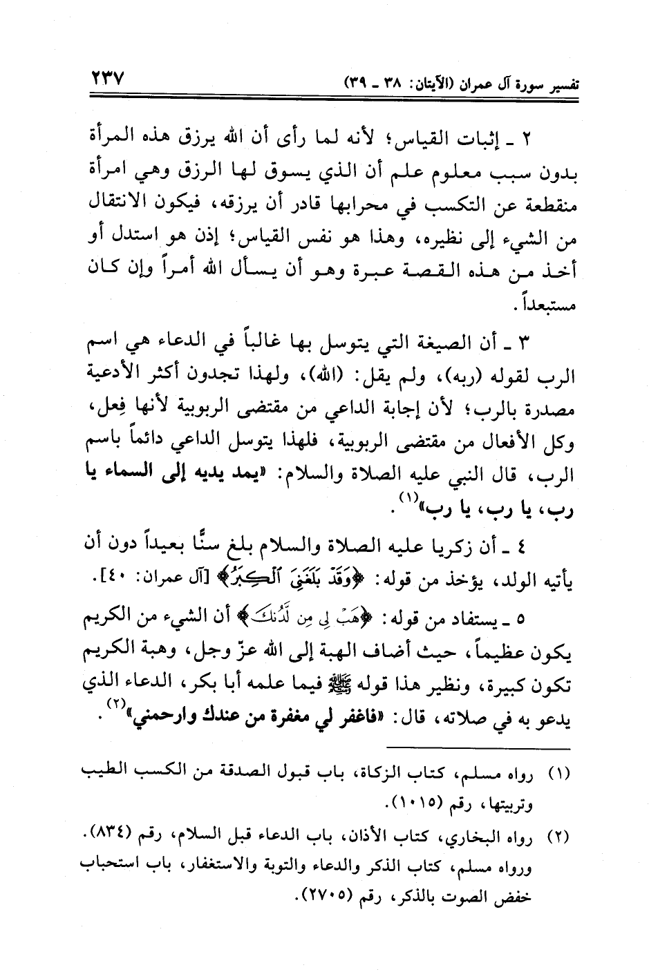 ٢ - إثبات القياس؛ لأنه لما رأى أن الله يرزق هذه المرأة بدون سبب معلوم علم أن الذي يسوق لها الرزق وهي امرأة منقطعة عن التكسب في محرابها قادر أن يرزقه، فيكون الانتقال من الشيء إلى نظيره، وهذا هو نفس القياس؛ إذن هو استدل أو أخذ من هذه القصة عبرة وهو أن يسأل الله أمرًا وإن كان مستبعدًا.