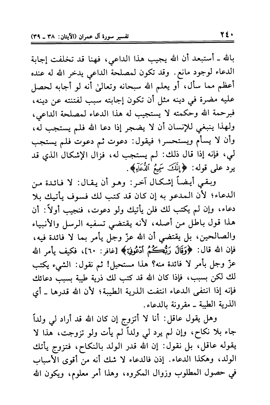 وبقي أيضًا إشكال آخر: وهو أن يقال: لا فائدة من الدعاء؛ لأن المدعو به إن كان قد كتب لك فسوف يأتيك بلا دعاء، وإن لم يكتب لك فلن يأتيك ولو دعوت، فنجيب أولًا: أن هذا قول باطل من أصله، لأنه يقتضي تسفيه الرسل والأنبياء والصالحين، بل يقتضي أن الله عزّ وجل يأمر بما لا فائدة فيه، فإن الله قال: {وَقَالَ رَبُّكُمُ ادْعُونِي} [غافر: ٦٠]، فكيف يأمر الله عزّ وجل بأمر لا فائدة منه؟ هذا مستحيل! ثم نقول: الشيء يكتب لك لكن بسبب، فإذا كان الله قد كتب لك ذرية طيبة بسبب دعائك فإنه إذا انتفى الدعاء انتفت الذرية الطيبة؛ لأن الله قدرها -أي الذرية الطيبة- مقرونة بالدعاء.