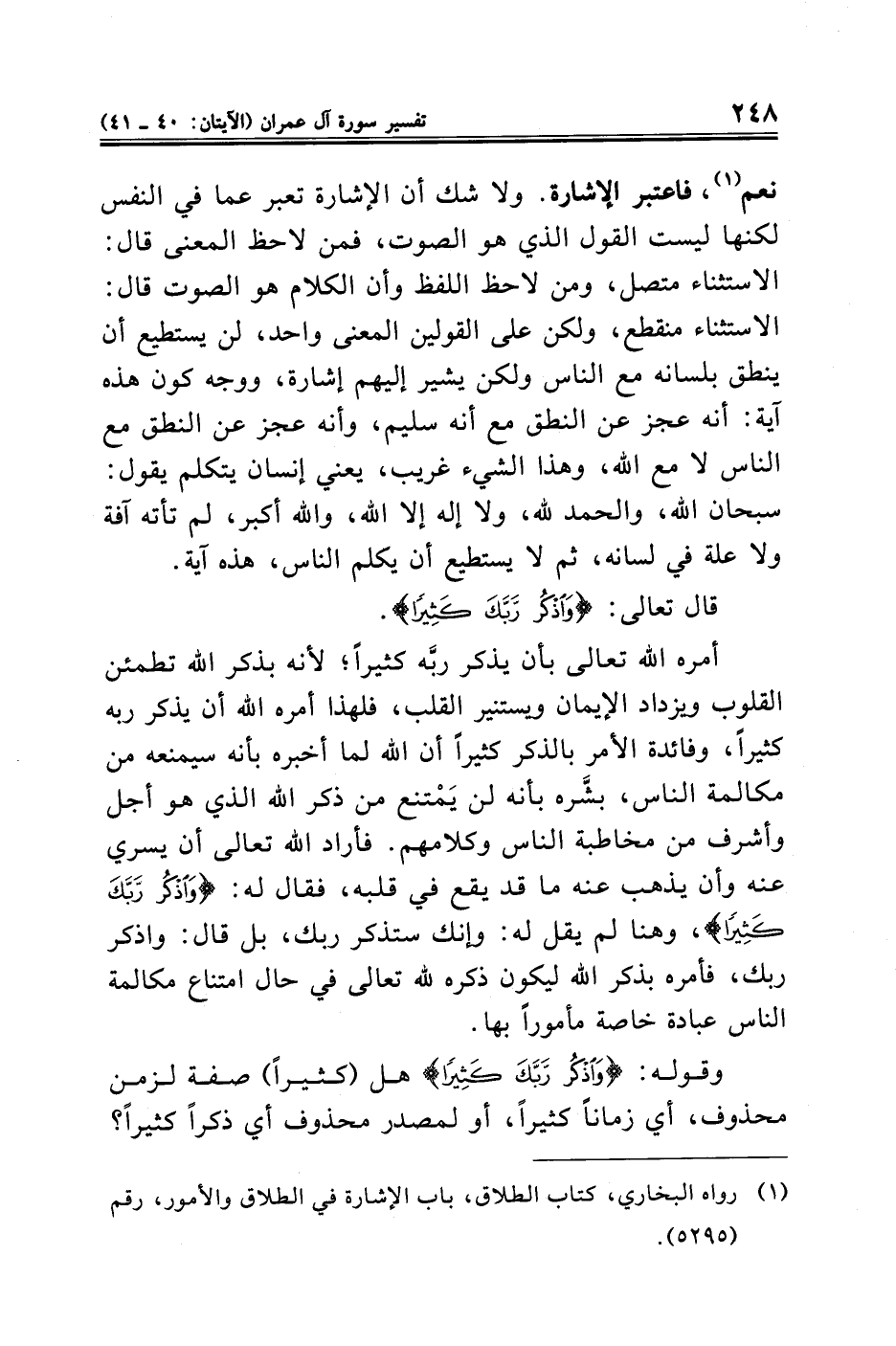 أمره الله تعالى بأن يذكر ربَّه كثيرًا؛ لأنه بذكر الله تطمئن القلوب ويزداد الإيمان ويستنير القلب، فلهذا أمره الله أن يذكر ربه كثيرًا، وفائدة الأمر بالذكر كثيرًا أن الله لما أخبره بأنه سيمنعه من مكالمة الناس، بشَّره بأنه لن يَمْتنع من ذكر الله الذي هو أجل وأشرف من مخاطبة الناس وكلامهم. فأراد الله تعالى أن يسري عنه وأن يذهب عنه ما قد يقع في قلبه، فقال له: {وَاذْكُرْ رَبَّكَ كَثِيرًا}، وهنا لم يقل له: وإنك ستذكر ربك، بل قال: واذكر ربك، فأمره بذكر الله ليكون ذكره لله تعالى في حال امتناع مكالمة الناس عبادة خاصة مأمورًا بها.