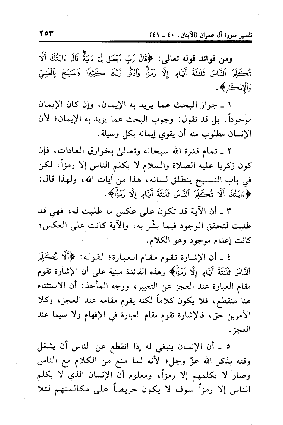 ٤ - أن الإشارة تقوم مقام العبارة؛ لقوله: {أَلَّا تُكَلِّمَ النَّاسَ ثَلَاثَةَ أَيَّامٍ إِلَّا رَمْزًا} وهذه الفائدة مبنية على أن الإشارة تقوم مقام العبارة عند العجز عن التعبير، ووجه المأخذ: أن الاستثناء هنا منقطع، فلا يكون كلامًا لكنه يقوم مقامه عند العجز، وكلا الأمرين حق، فالإشارة تقوم مقام العبارة في الإفهام ولاسيما عند العجز.