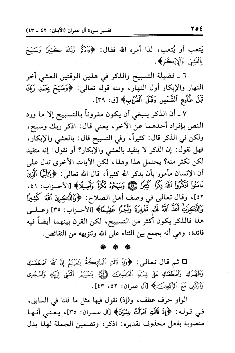 ٧ - أن الذكر ينبغي أن يكون مقرونًا بالتسبيح إلا ما ورد النص بإفراد أحدهما عن الآخر، يعني قال: اذكر ربك وسبح، ولكن في الذكر قال: كثيرًا، وفي التسبيح قال: بالعشي والإبكار، فهل نقول: إن الذكر لا يتقيد بالعشي والإبكار؟ أو نقول: إنه متقيد لكن نكثر منه؟ يحتمل هذا وهذا، لكن الآيات الأخرى تدل على أن الإنسان مأمور بأن يذكر الله كثيرًا، قال الله تعالى: {يَاأَيُّهَا الَّذِينَ آمَنُوا اذْكُرُوا اللَّهَ ذِكْرًا كَثِيرًا (٤١) وَسَبِّحُوهُ بُكْرَةً وَأَصِيلًا} [الأحزاب: ٤١, ٤٢]، وقال تعالى في وصف أهل الصلاح: {وَالذَّاكِرِينَ اللَّهَ كَثِيرًا وَالذَّاكِرَاتِ أَعَدَّ اللَّهُ لَهُمْ مَغْفِرَةً وَأَجْرًا عَظِيمًا} [الأحزاب: ٣٥] وعلى هذا فالذكر يكون أكثر من التسبيح، لكن القرن بينهما أيضًا فيه فائدة، وهي أنه يجمع بين الثناء على الله وتنزيهه من النقائص.
