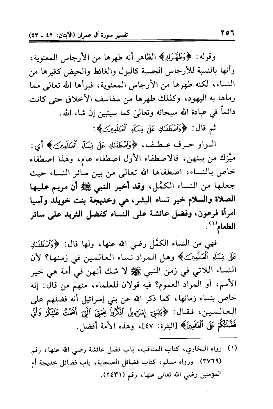 الواو حرف عطف، {وَاصْطَفَاكِ عَلَى نِسَاءِ الْعَالَمِينَ} أي: ميَّزك من بينهن، فالاصطفاء الأول اصطفاء عام، وهذا اصطفاء خاص بالنساء، اصطفاها الله تعالى من بين سائر النساء حيث جعلها من النساء الكمَّل، وقد أخبر النبي - صلى الله عليه وسلم - أن مريم عليها الصلاة والسلام خير نساء البشر، هي وخديجة بنت خويلد وآسيا امرأة فرعون، وفضل عائشة على النساء كفضل الثريد على سائر الطعام (¬١).