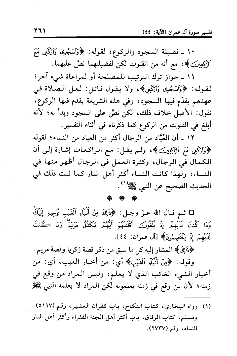 ١٢ - أن العُبَّاد من الرجال أكثر من العباد من النساء؛ لقوله {وَارْكَعِي مَعَ الرَّاكِعِينَ}، ولم يقل: مع الراكعات إشارة إلى أن الكمال في الرجال، وكثرة العمل في الرجال أظهر منها في النساء، ولهذا كانت النساء أكثر أهل النار كما ثبت ذلك في الحديث الصحيح عن النبي - صلى الله عليه وسلم - (¬١).