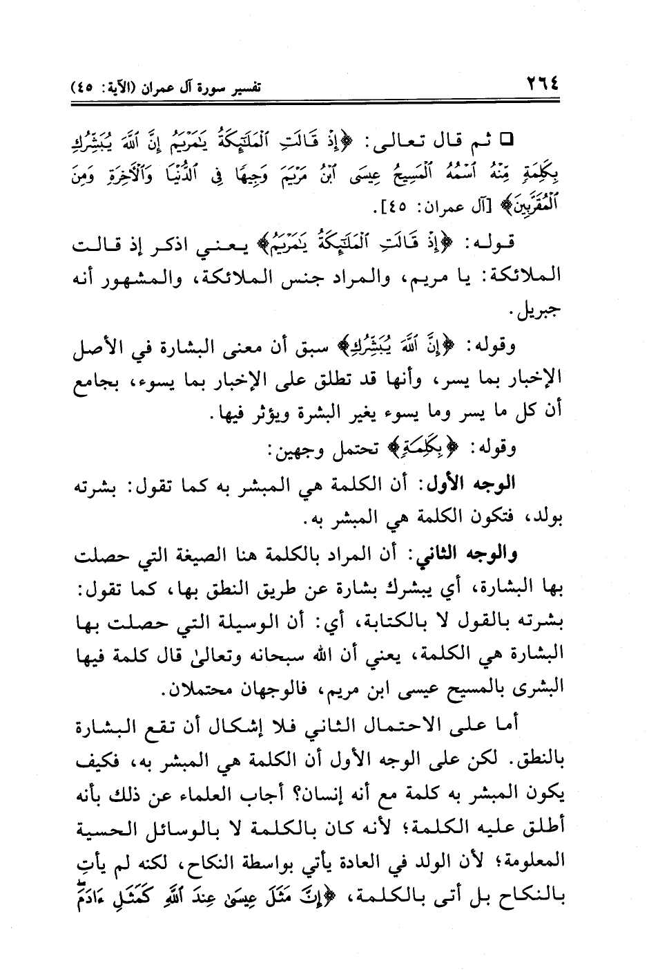 أما على الاحتمال الثاني فلا إشكال أن تقع البشارة بالنطق. لكن على الوجه الأول أن الكلمة هي المبشر به، فكيف يكون المبشر به كلمة مع أنه إنسان؟ أجاب العلماء عن ذلك بأنه أطلق عليه الكلمة؛ لأنه كان بالكلمة لا بالوسائل الحسية المعلومة؛ لأن الولد في العادة يأتي بواسطة النكاح، لكنه لم يأتِ بالنكاح بل أتى بالكلمة، {إِنَّ مَثَلَ عِيسَى عِنْدَ اللَّهِ كَمَثَلِ آدَمَ