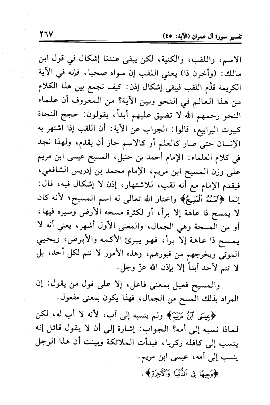 الاسم، واللقب، والكنية، لكن يبقى عندنا إشكال فى قول ابن مالك: (وأخرن ذا) يعني اللقب إن سواه صحبا، فإنه في الآية الكريمة قدَّم اللقب فيبقى إشكال إذن: كيف نجمع بين هذا الكلام من هذا العالم في النحو وبين الآية؟ من المعروف أن علماء النحو رحمهم الله لا تضيق عليهم أبدًا، يقولون: حجج النحاة كبيوت اليرابيع، قالوا: الجواب عن الآية: أن اللقب إذا اشتهر به الإنسان حتى صار كالعلم أو كالاسم جاز أن يقدم، ولهذا نجد فى كلام العلماء: الإمام أحمد بن حنبل, المسيح عيسى ابن مريم على وزن المسيح ابن مريم، الإمام محمد بن إدريس الشافعي، فيقدم الإمام مع أنه لقب، للاشتهار, إذن لا إشكال فيه، قال: إنما {اسْمُهُ الْمَسِيحُ} واختار الله تعالى له اسم المسيح؛ لأنه كان لا يمسح ذا عاهة إلا برأ، أو لكثرة مسحه الأرض وسيره فيها، أو من المسحة وهي الجمال، والمعنى الأول أشهر، يعني أنه لا يمسح ذا عاهة إلا برأ، فهو يبرئ الأكمه والأبرص، ويحيي الموتى ويخرجهم من قبورهم، وهذه الأمور لا تتم لكل أحد، بل لا تتم لأحد أبدًا إلا بإذن الله عزّ وجل.