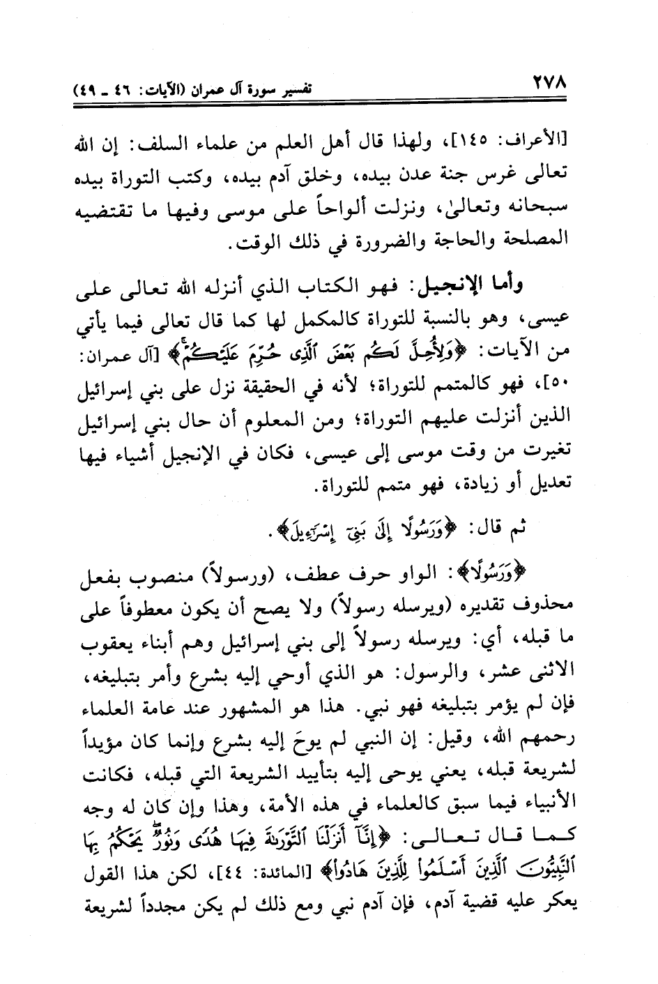 وأما الإنجيل: فهو الكتاب الذي أنزله الله تعالى على عيسى، وهو بالنسبة للتوراة كالمكمل لها كما قال تعالى فيما يأتي من الآيات: {وَلِأُحِلَّ لَكُمْ بَعْضَ الَّذِي حُرِّمَ عَلَيْكُمْ} [آل عمران: ٥٠]، فهو كالمتمم للتوراة؛ لأنه في الحقيقة نزل على بني إسرائيل الذين أنزلت عليهم التوراة؛ ومن المعلوم أن حال بني إسرائيل تغيرت من وقت موسى إلى عيسى، فكان في الإنجيل أشياء فيها تعديل أو زيادة، فهو متمم للتوراة.